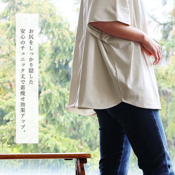 隠したいところ隠してくれて、『カッコよく』リラックス。 【メール便50】 着痩せ チュニック tシャツ ロング ワイド レディース 五分袖 すっきり 切替 ゆったり tシャツ しっかり 柔らか 綿100% USA コットン バック ボタン ポケット お尻 二の腕 隠れる カバー 5分袖 半袖 大人 カジュアル パティ Souple スプル