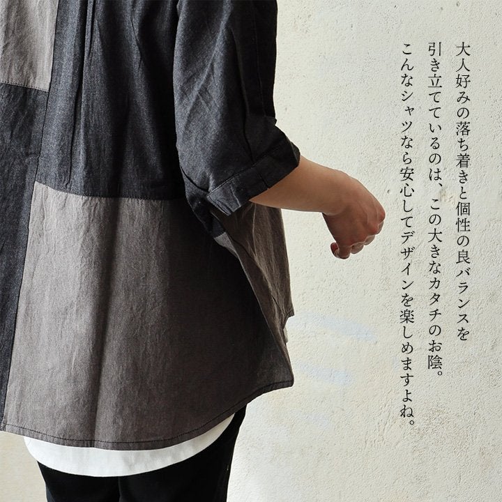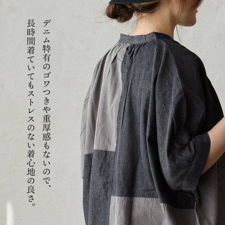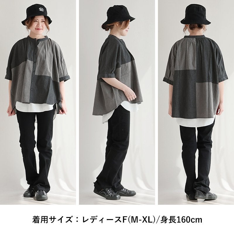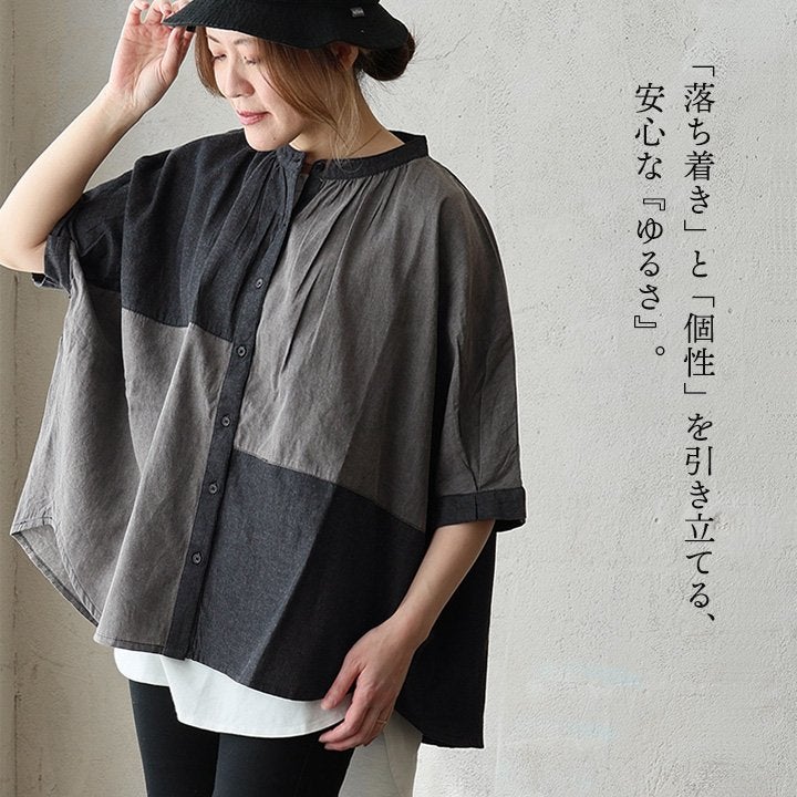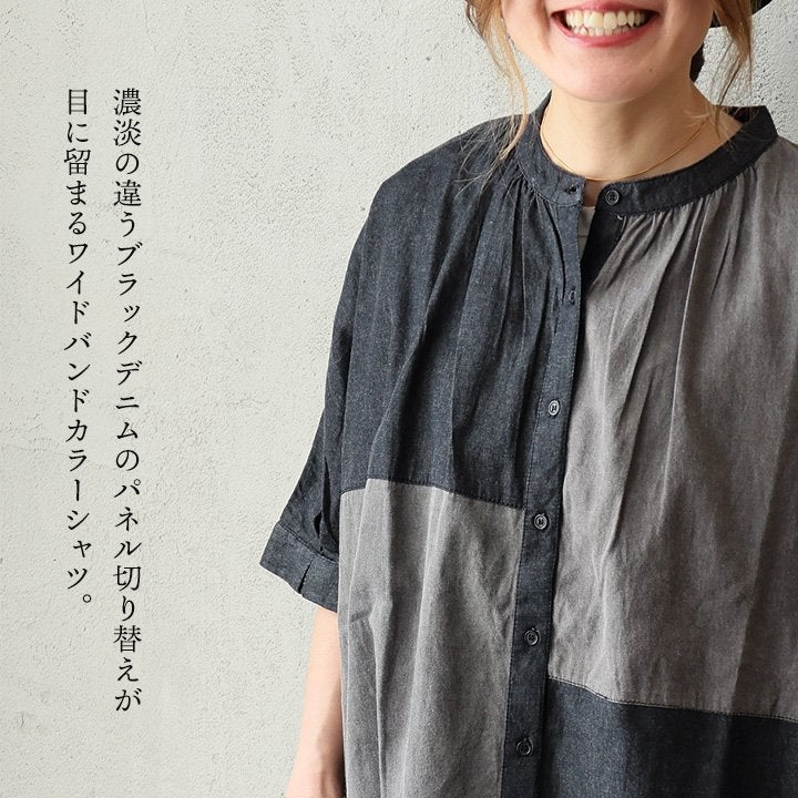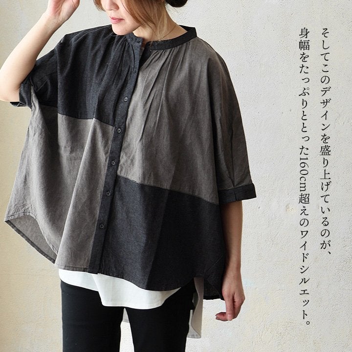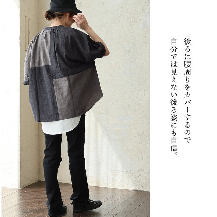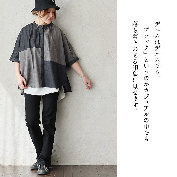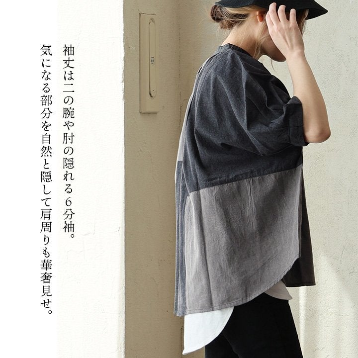 「落ち着き」と「個性」を引き立てる、安心な『ゆるさ』。 シャツ 6分袖 レディース バンドカラー 無地 綿100 コットン ワイド 大きいサイズ 体型カバー 二の腕カバー 配色 デニム ブラック 軽い 薄手 通気性 涼しい カジュアル パティ