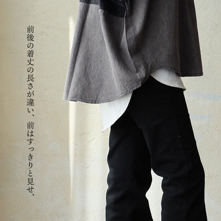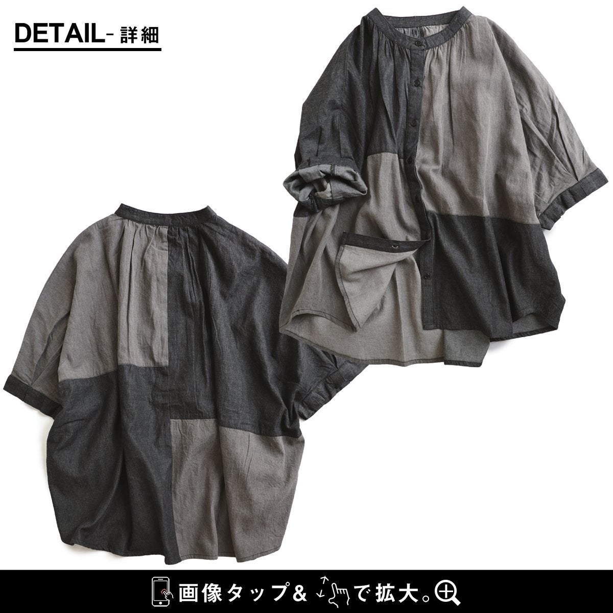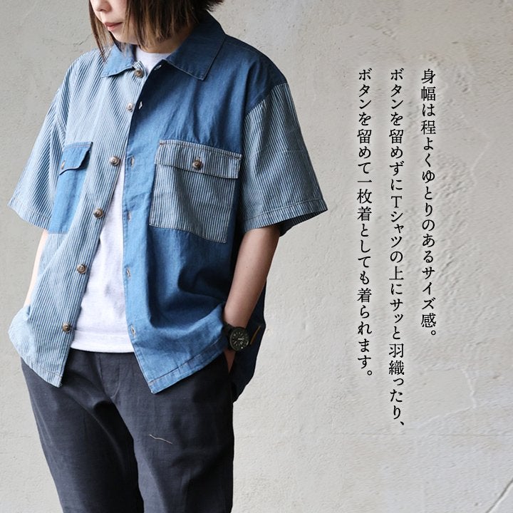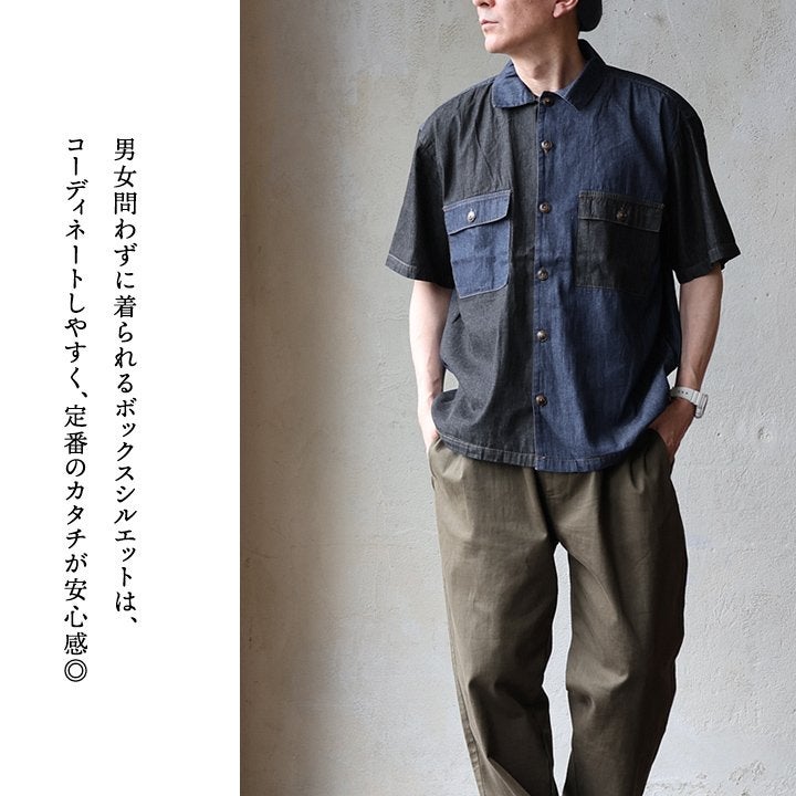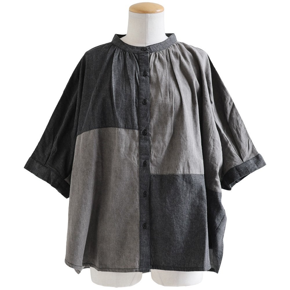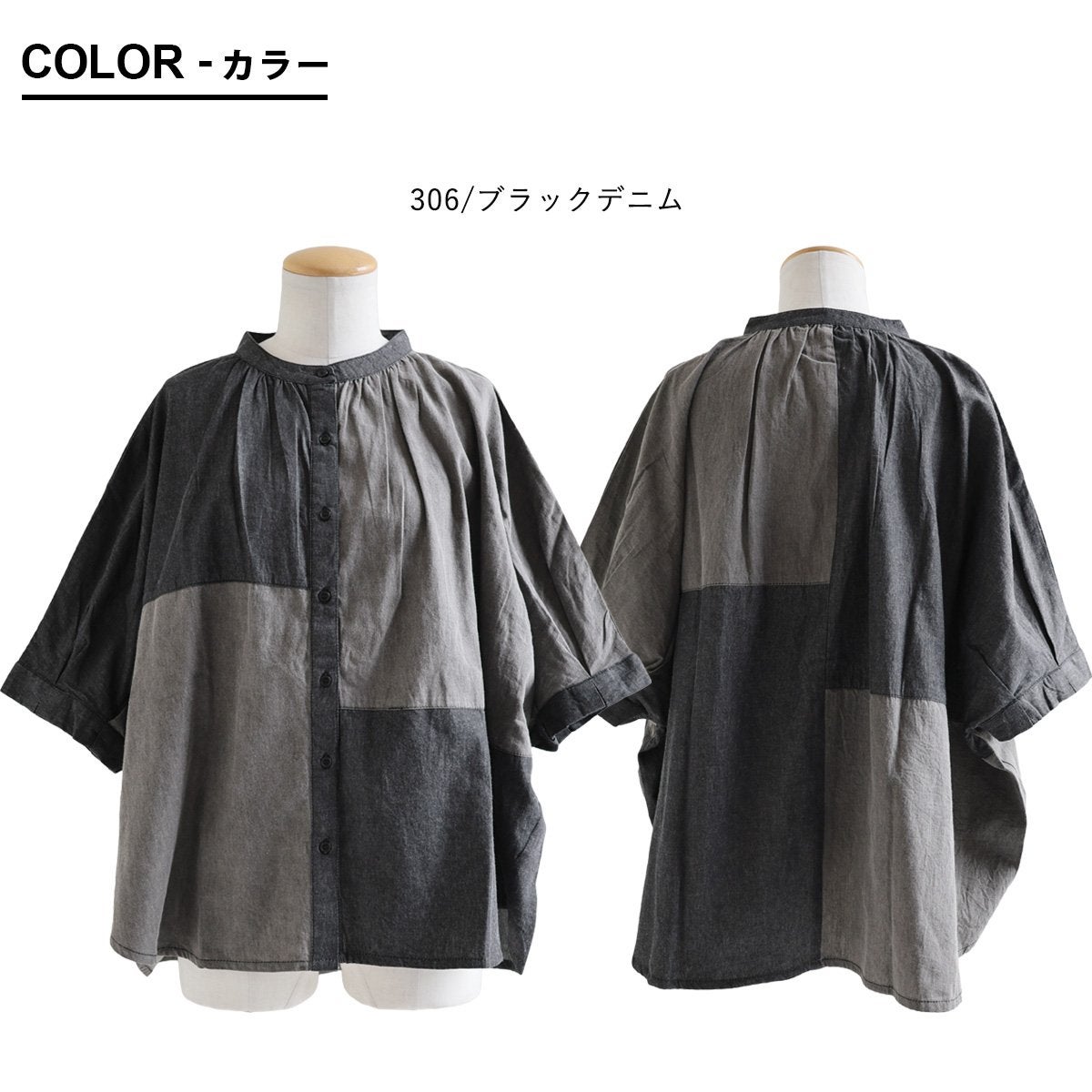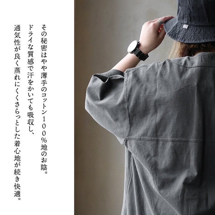 「落ち着き」と「個性」を引き立てる、安心な『ゆるさ』。 シャツ 6分袖 レディース バンドカラー 無地 綿100 コットン ワイド 大きいサイズ 体型カバー 二の腕カバー 配色 デニム ブラック 軽い 薄手 通気性 涼しい カジュアル パティ