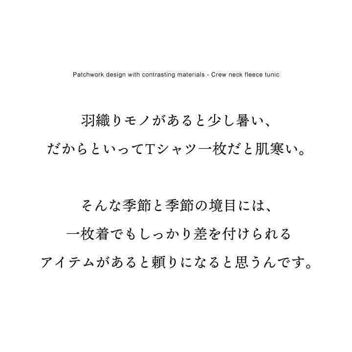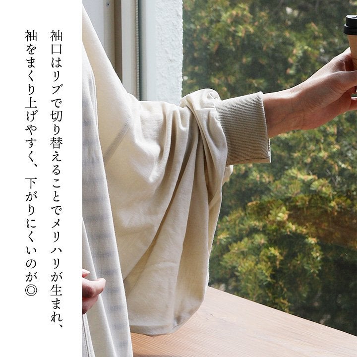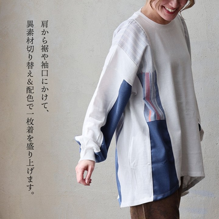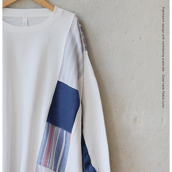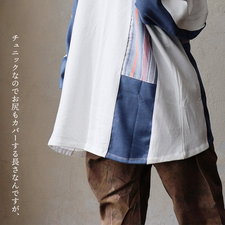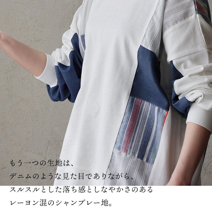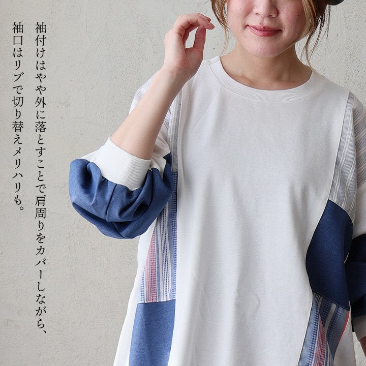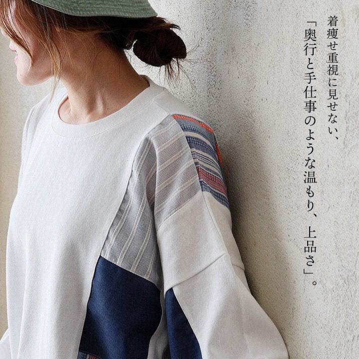 着痩せ重視に見せない、「奥行と手仕事のような温もり、上品さ」。 チュニック 長袖 レディース クルーネック お尻隠れる 着痩せ スウェット 異素材切り替え 配色 ストライプ 綿100 コットン 裏毛 袖リブ 大きいサイズ 体型カバー カジュアル パティ