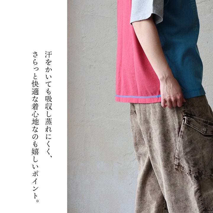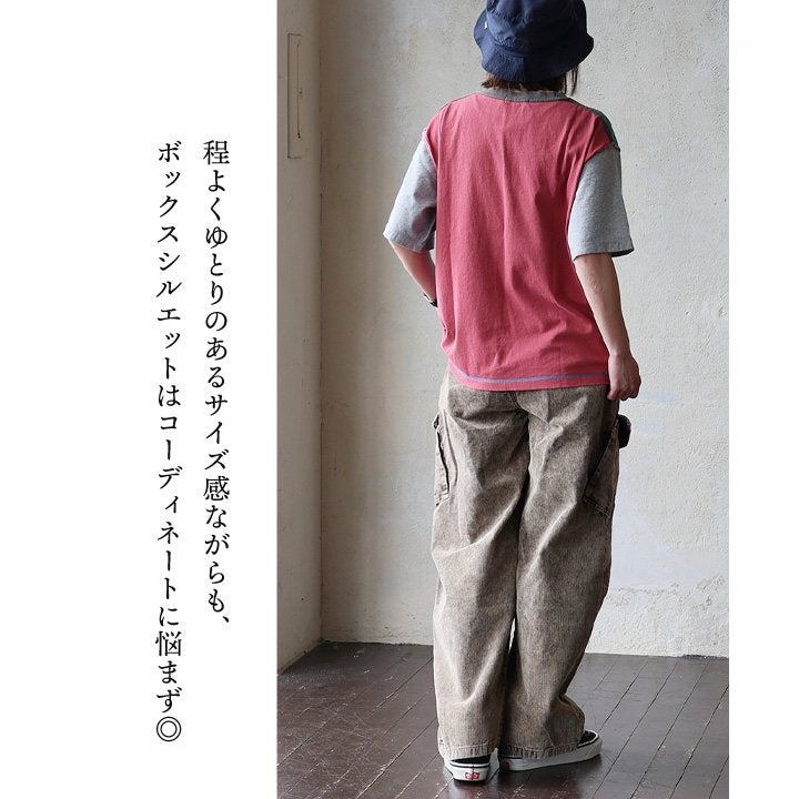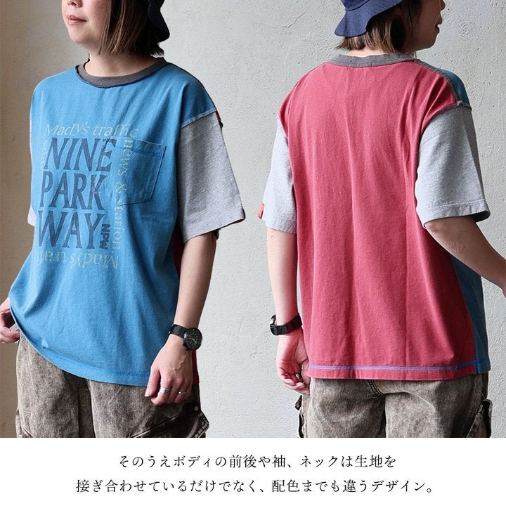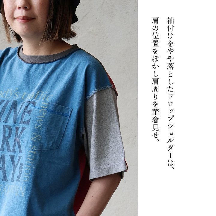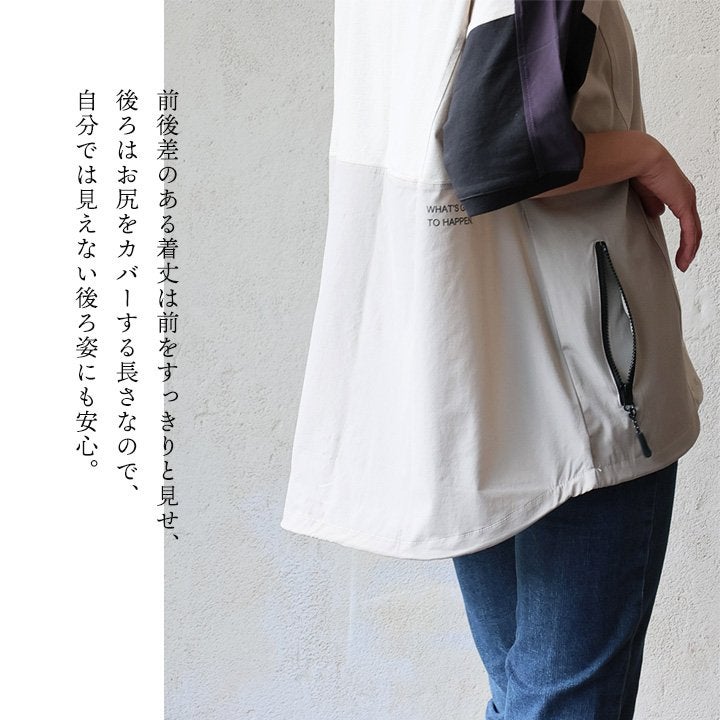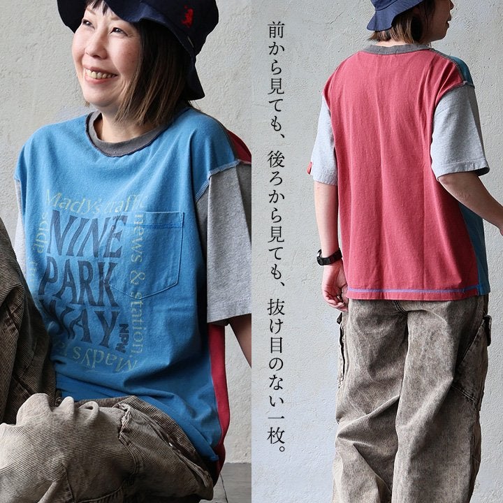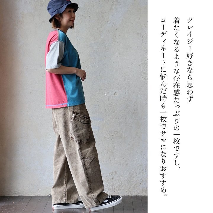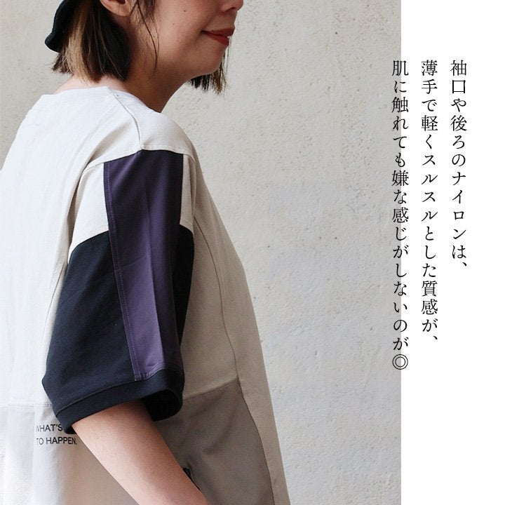 Tシャツ一枚着も、こんな自信に繋がる遊びがあったら。 【メール便50】 Tシャツ 5分袖 レディース クルーネック 配色 異素材切り替え クレイジー 綿 コットン ナイロン ストレッチ 薄手 軽い 涼しい ゆったり 大きいサイズ 体型カバー カジュアル 夏 レトロ パティ