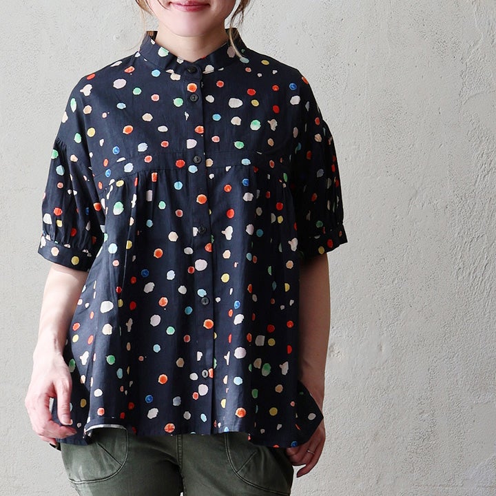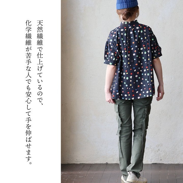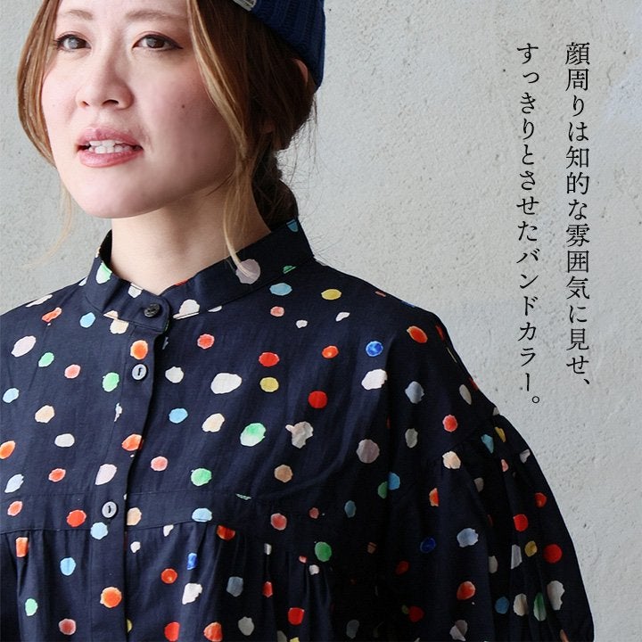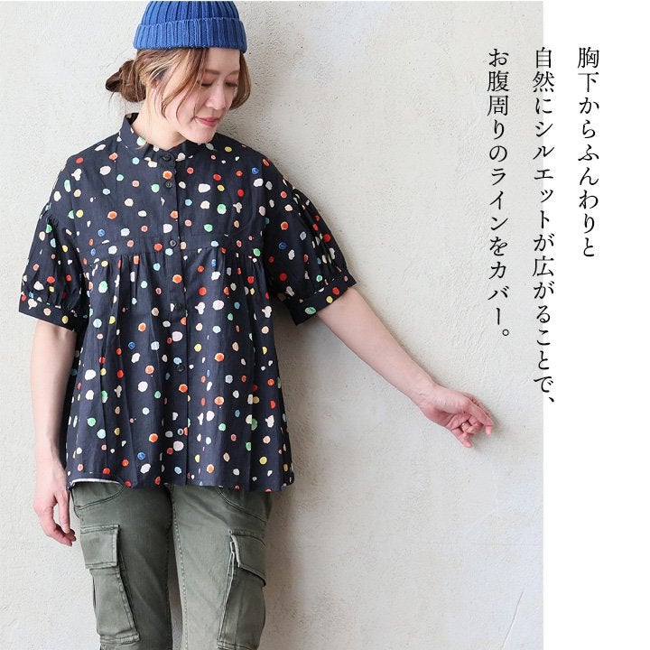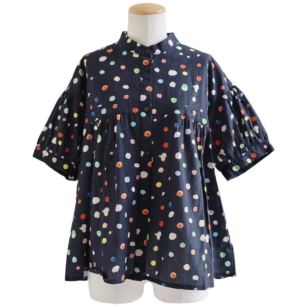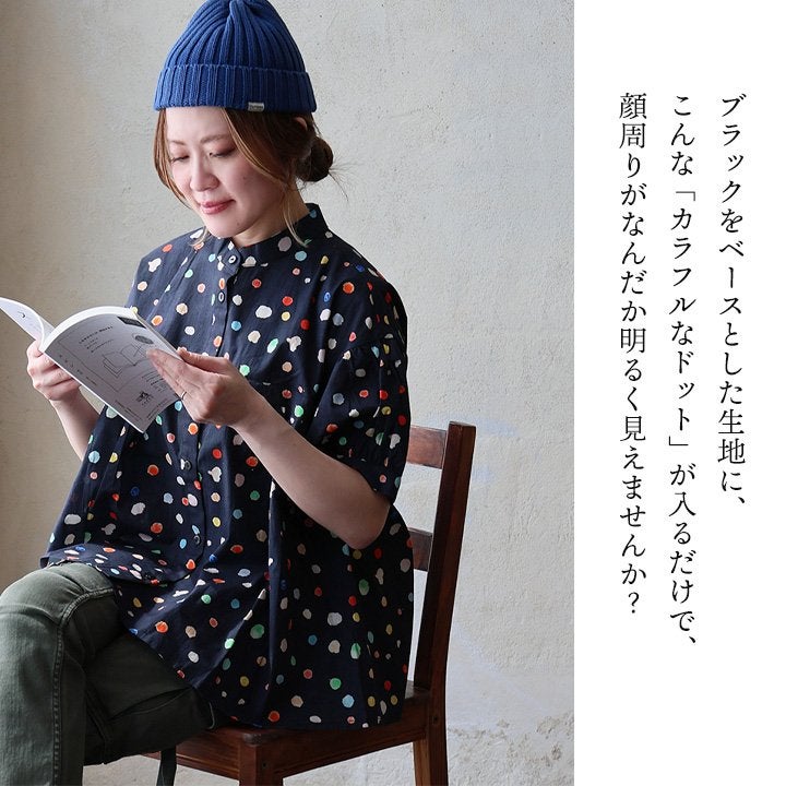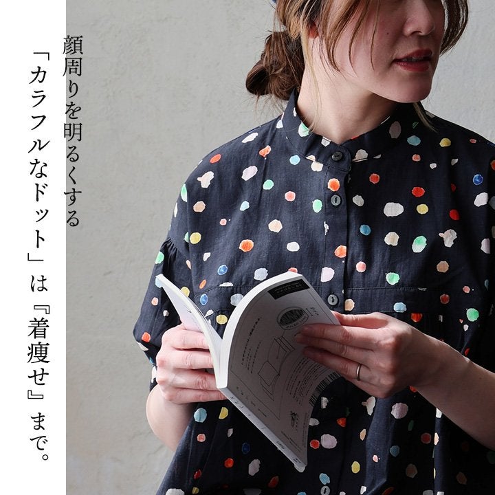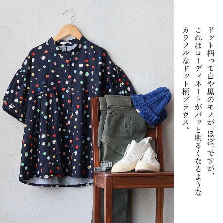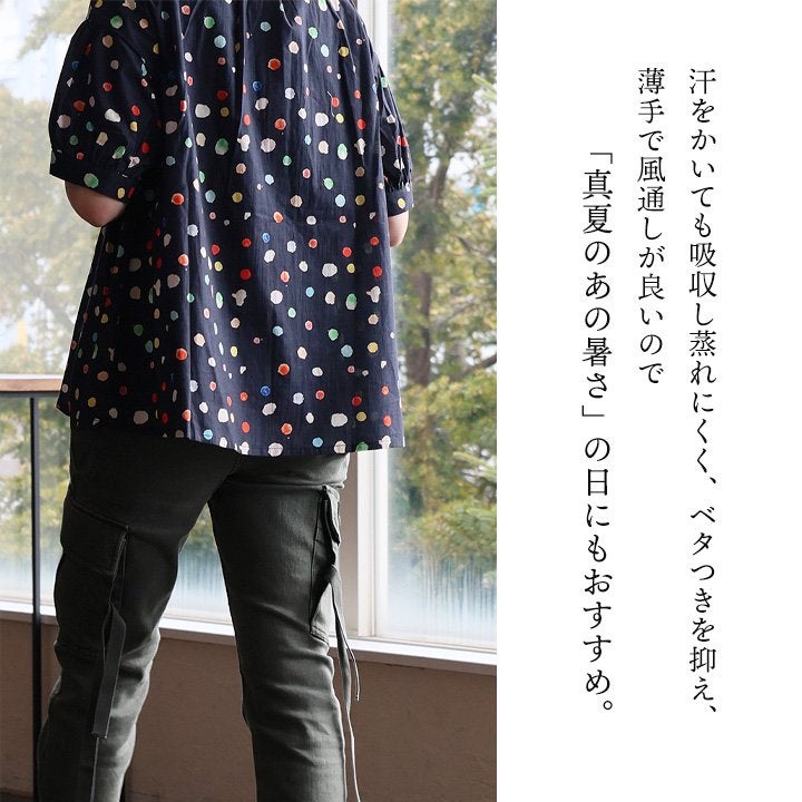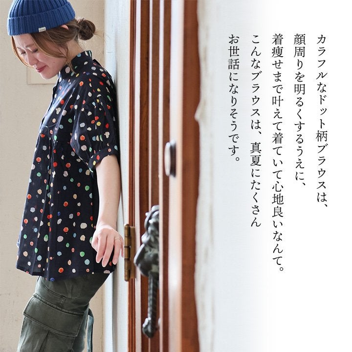 顔周りを明るくする「カラフルなドット」は『着痩せ』まで。 【メール便50】 シャツ 5分袖 レディース バンドカラー 総柄 ドット柄 カラフル 綿100 コットン 薄手 通気性 蒸れにくい 涼しい 軽い 着痩せ すっきり カジュアル 春 夏 パティ