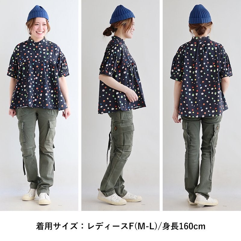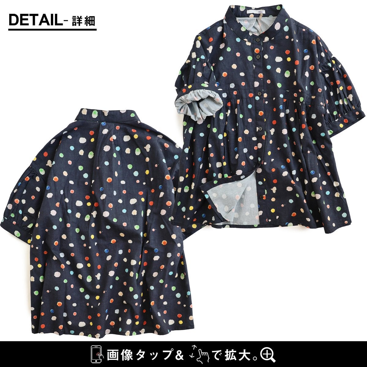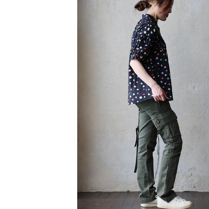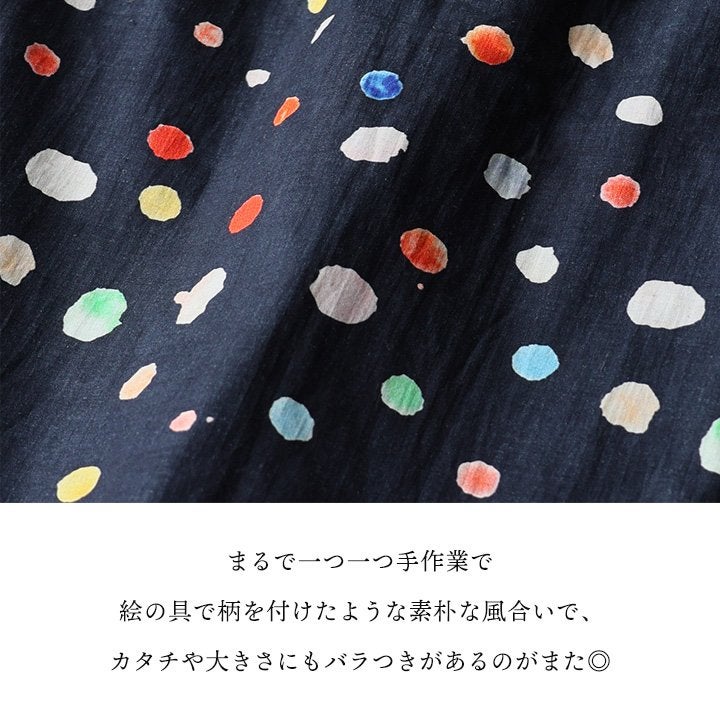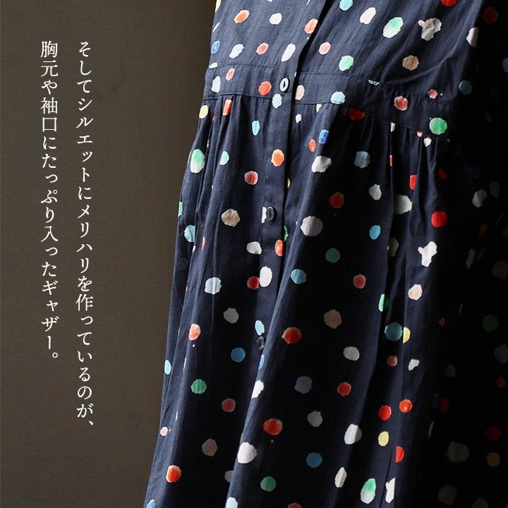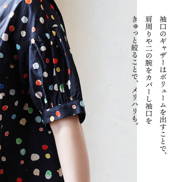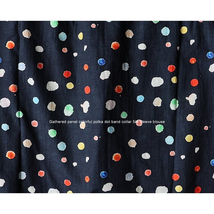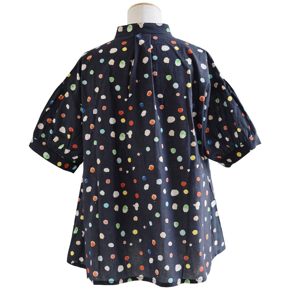 顔周りを明るくする「カラフルなドット」は『着痩せ』まで。 【メール便50】 シャツ 5分袖 レディース バンドカラー 総柄 ドット柄 カラフル 綿100 コットン 薄手 通気性 蒸れにくい 涼しい 軽い 着痩せ すっきり カジュアル 春 夏 パティ