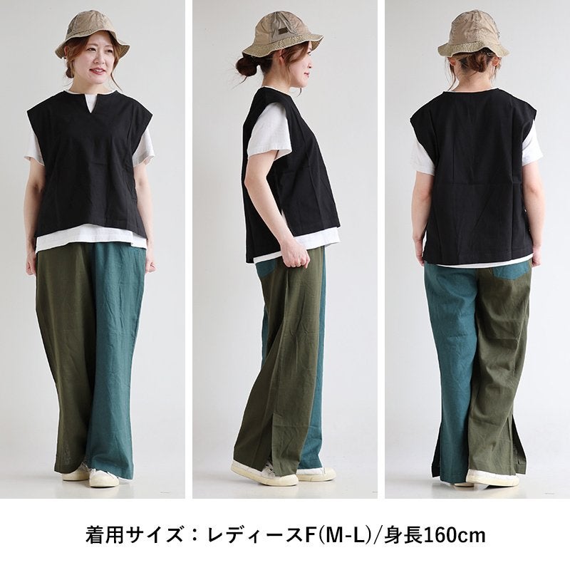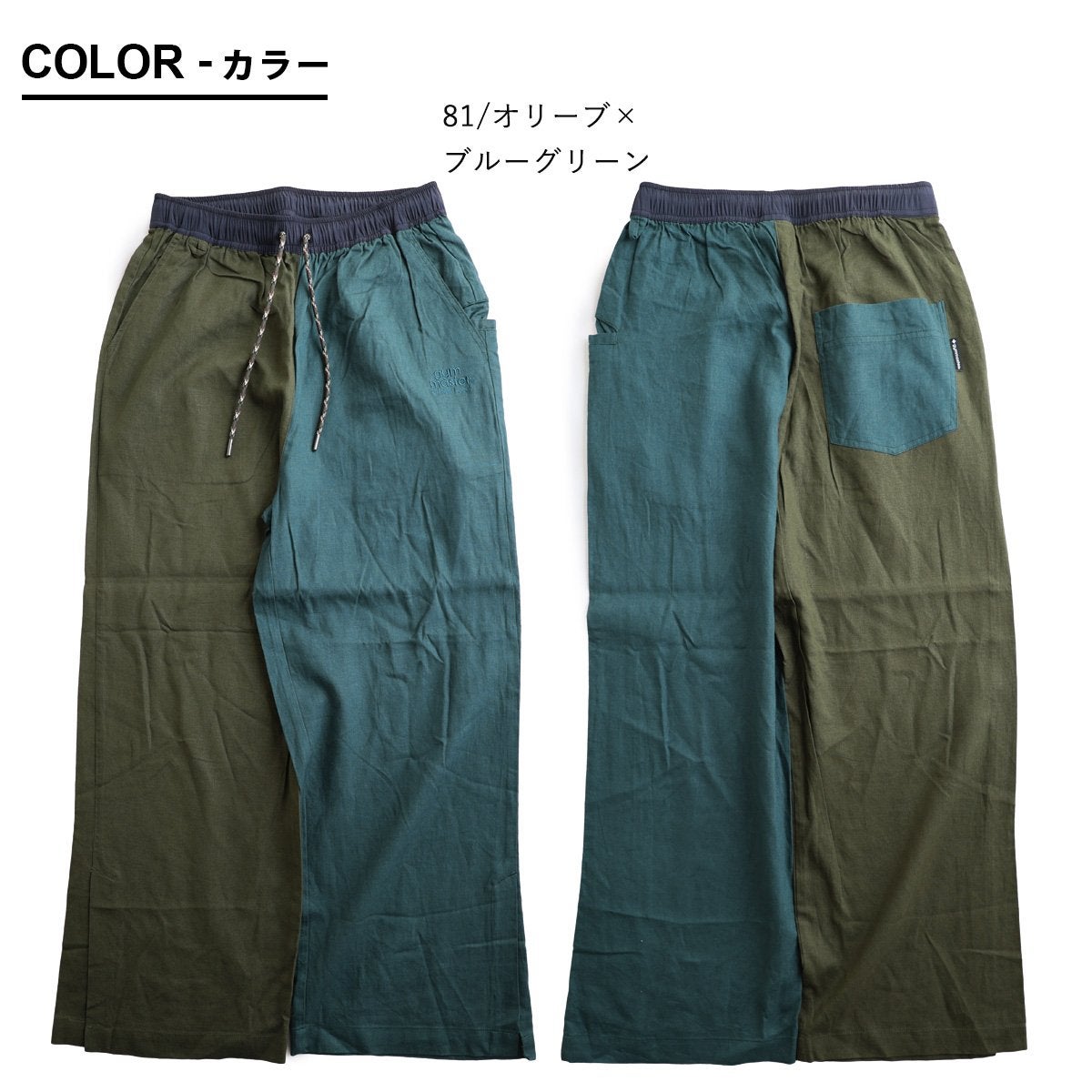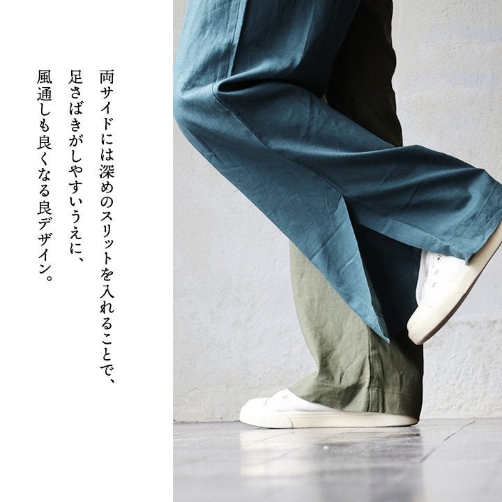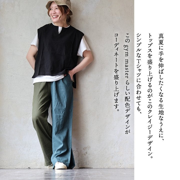 涼しく、軽く、暑い夏を盛り上げる。 gym master ジムマスター パンツ ワイドパンツ レディース 配色 麻 レーヨン 薄手 涼しい 軽い 通気性 楽ちん 裾スリット ウエストゴム ゆったり 大きいサイズ 体型カバー カジュアル レトロ クレイジー 夏 パティ