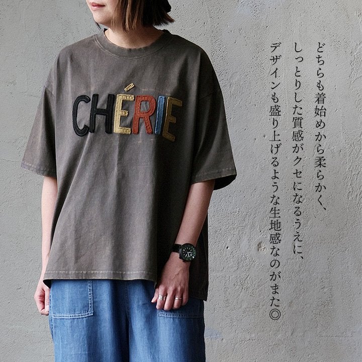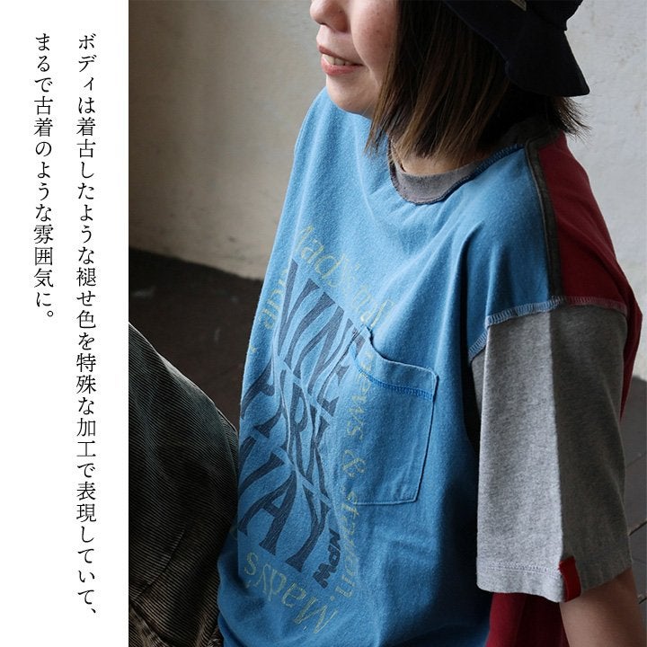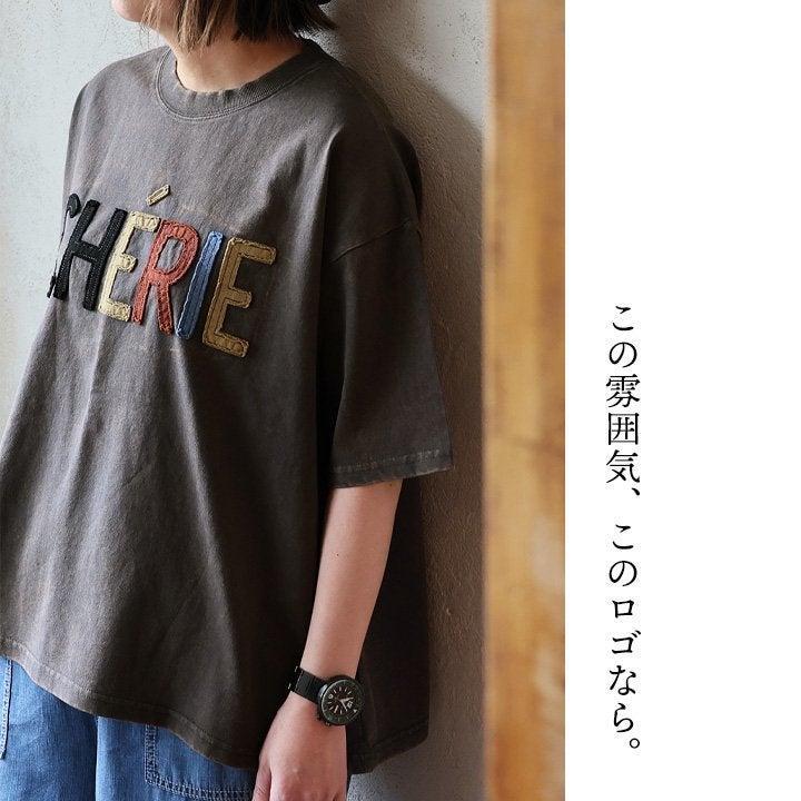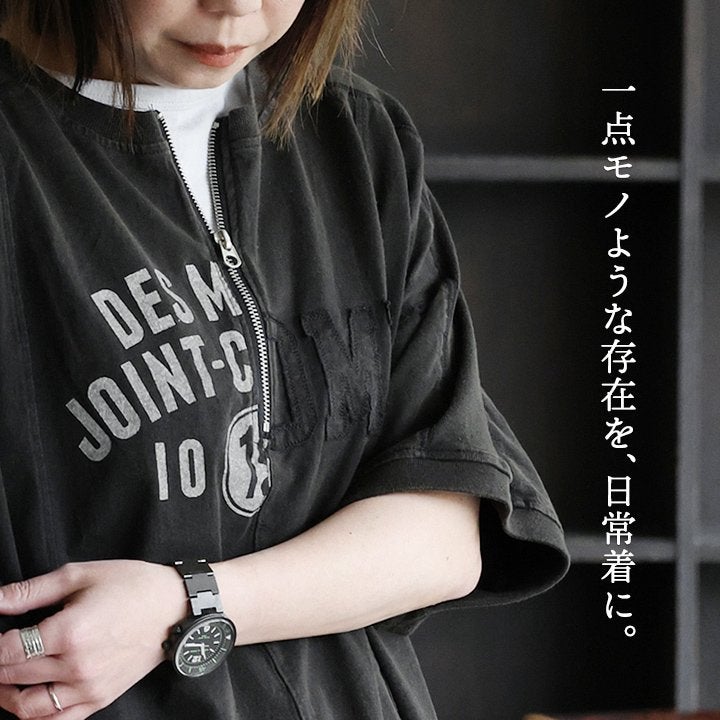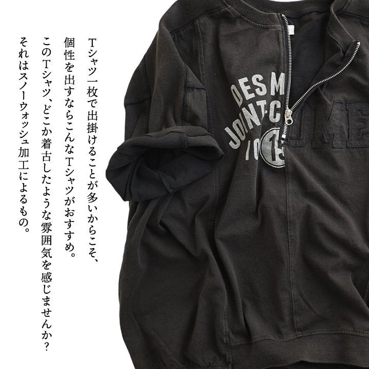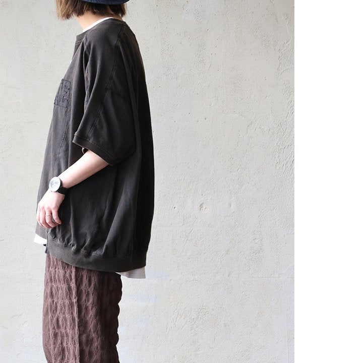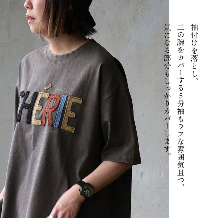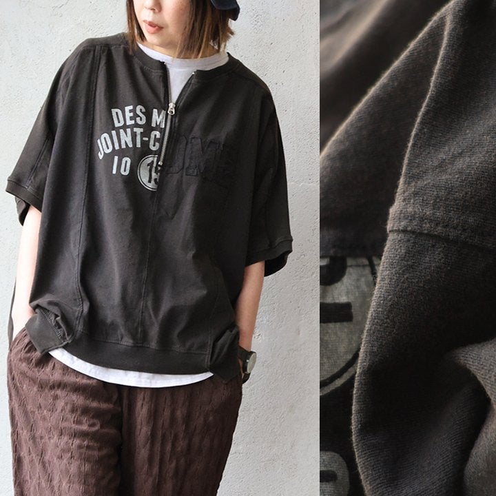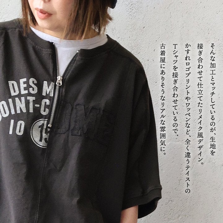 一点モノような存在を、日常着に。 Tシャツ 5分袖 レディース ハーフジップ 綿100 コットン 天竺 しっかり生地 褪せ色 リメイク ロゴプリント 大きいサイズ 体型カバー 重ね着 カジュアル レトロ 夏 パティ