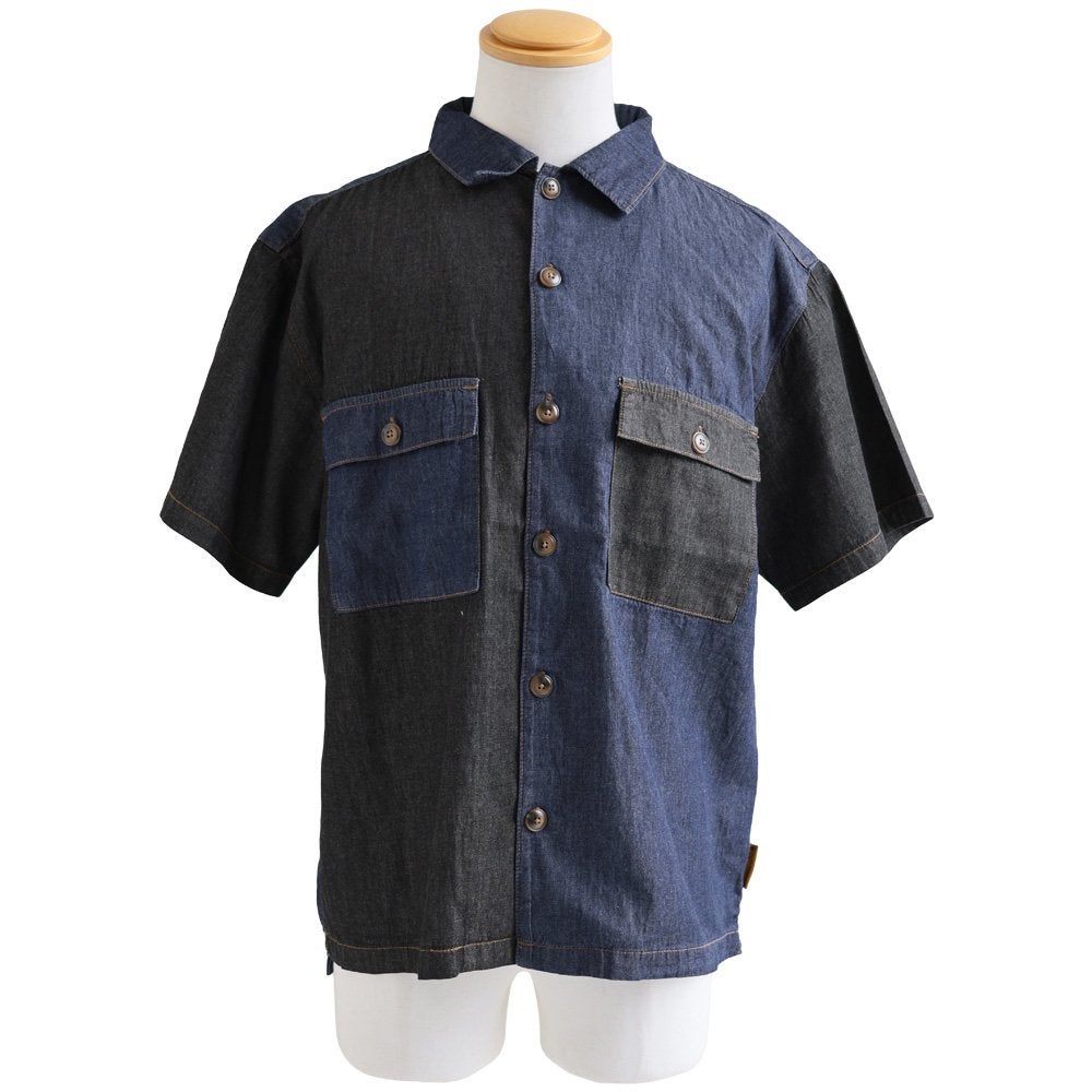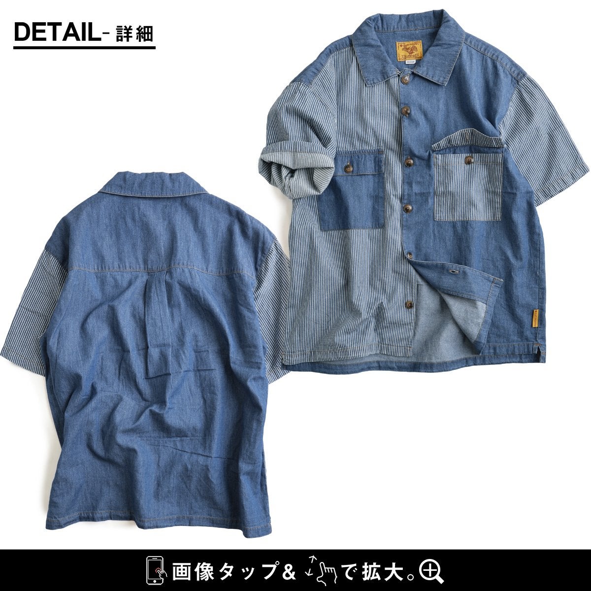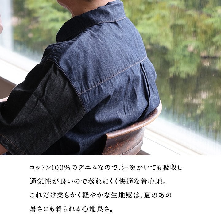 夏の暑さにも負けない、軽やかデニムシャツ。 gym master ジムマスター シャツ デニムシャツ 5分袖 前開き 配色 デニム 綿100 コットン 薄手 軽やか 柔らかい 通気性 涼しい 大きいサイズ 体型カバー 重ね着 カジュアル 夏 パティ
