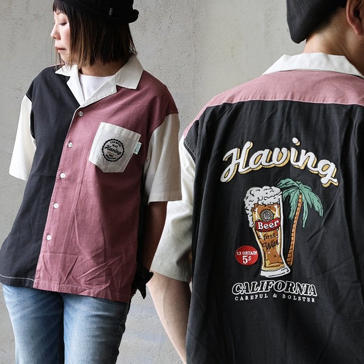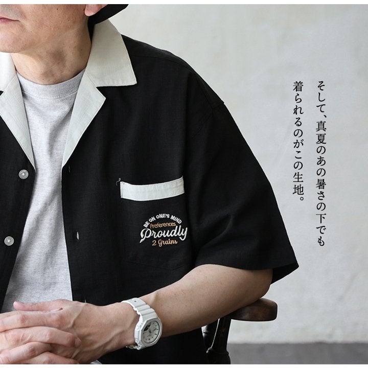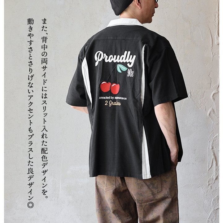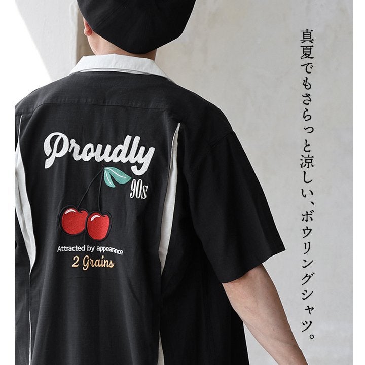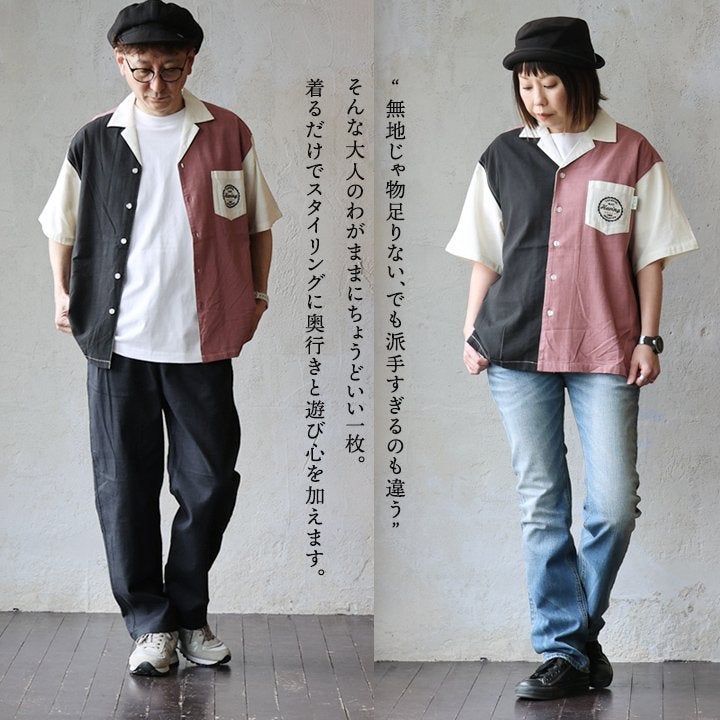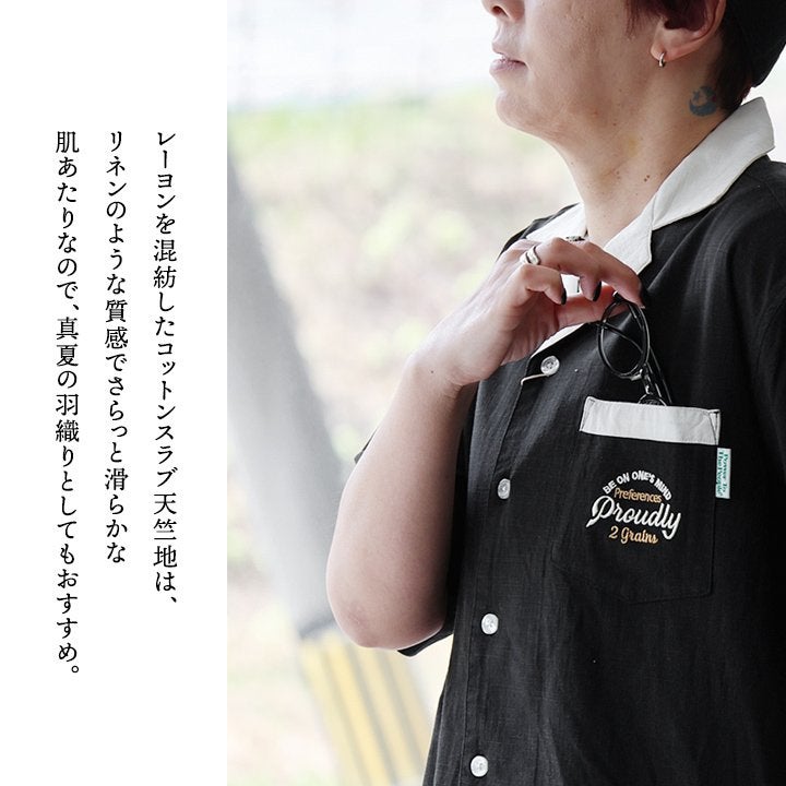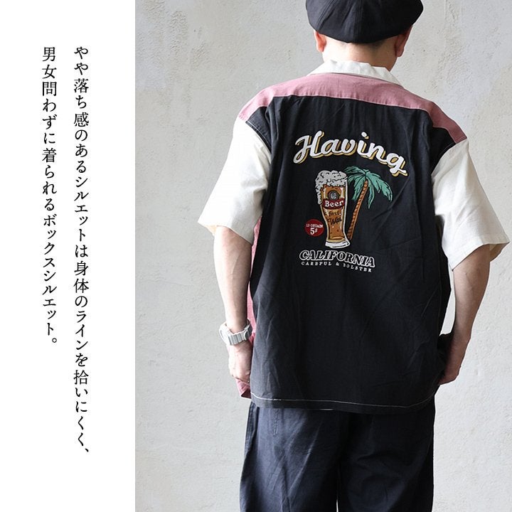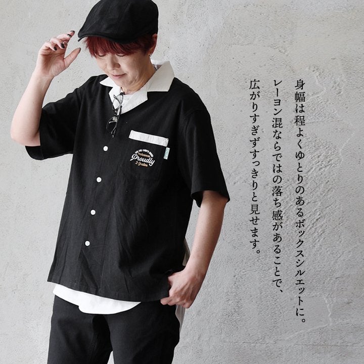 真夏でもさらっと涼しい、ボウリングシャツ。 ボウリングシャツ シャツ 5分袖 メンズ レディース 配色 チェーンステッチ 刺繍 配色 コットン レーヨン スラブ天竺 薄手 軽い 伸縮性 涼しい カジュアル 夏 パティ