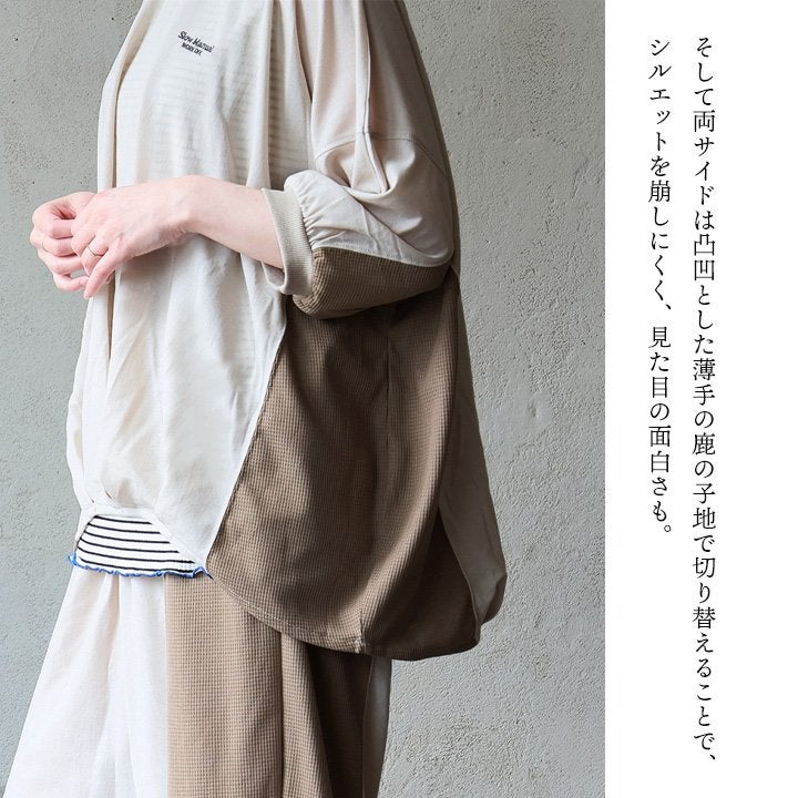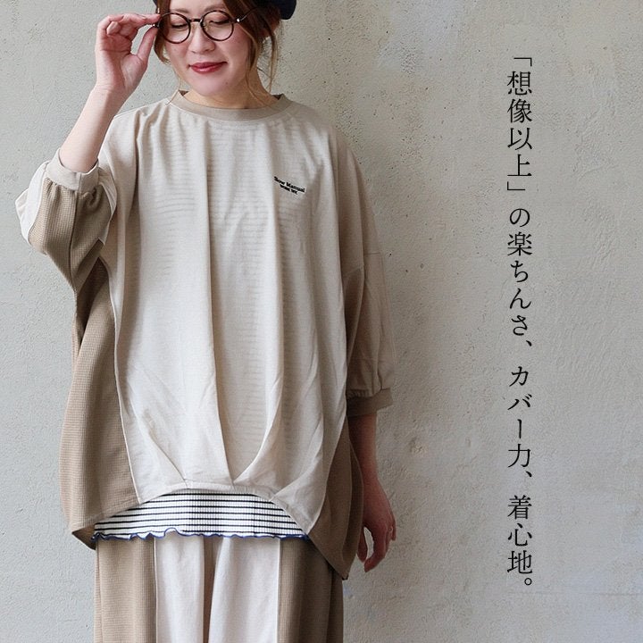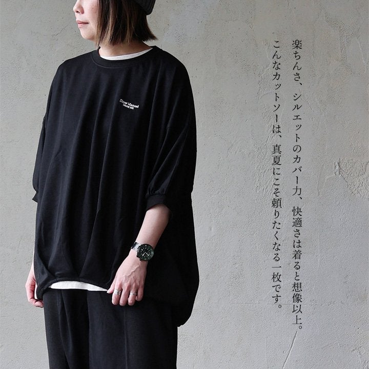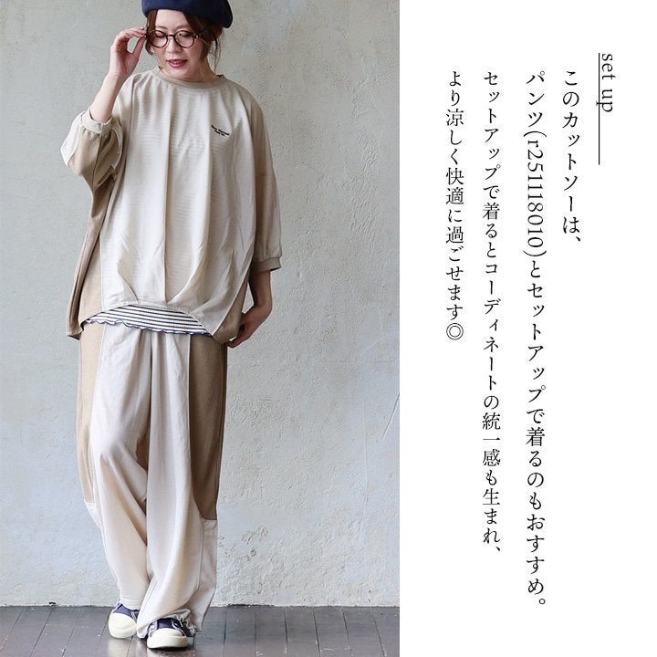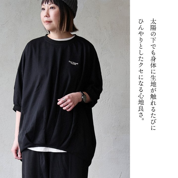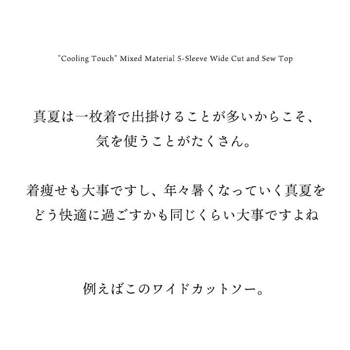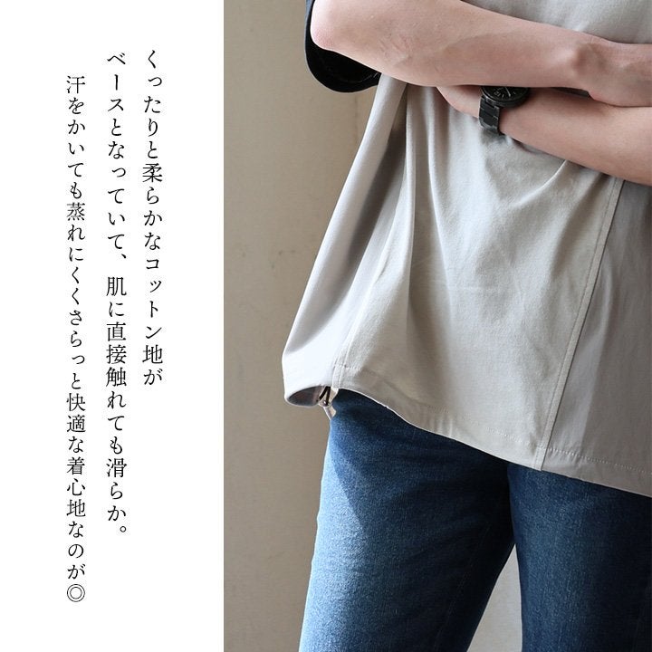 見た目はゆるく、着心地は想像以上。 カットソー 5分袖 クルーネック 接触冷感 ひんやり 涼しい 異素材切り替え 薄手 軽い 袖リブ ゆったり 大きいサイズ 体型カバー カジュアル 夏 パティ