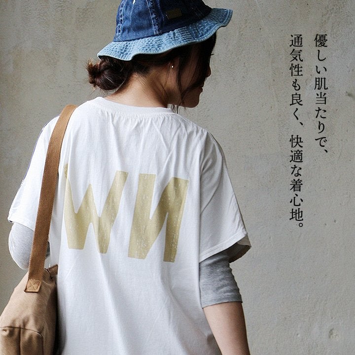 古着のような雰囲気。ゆるっとラフ。 Tシャツ 5分袖 レディース クルーネック 綿100 コットン 天竺 しっかり生地 褪せ色 スノーウォッシュ ロゴプリント ゆったり 大きいサイズ 体型カバー カジュアル 夏 パティ