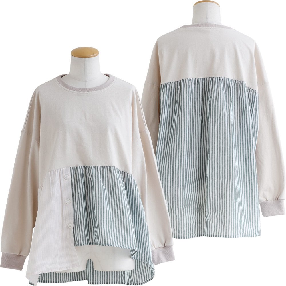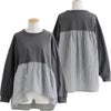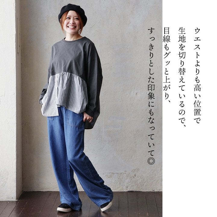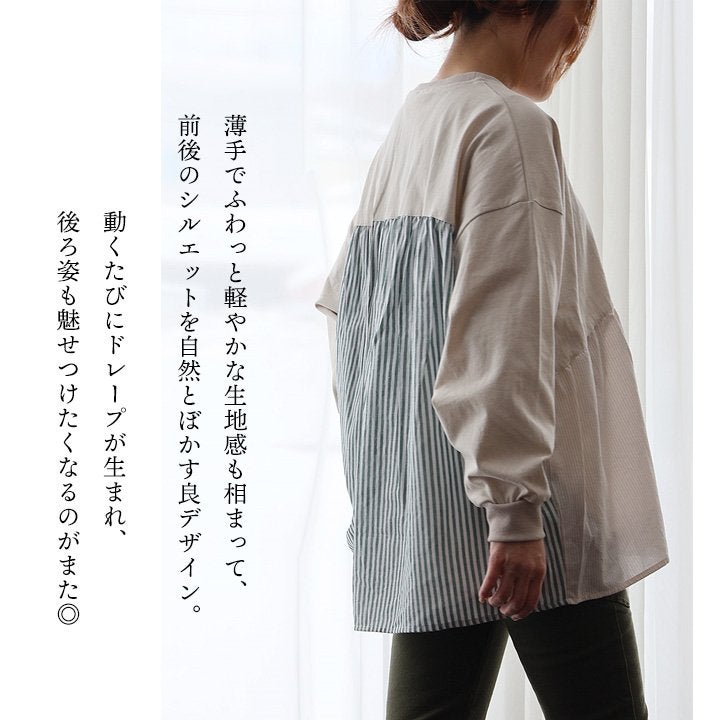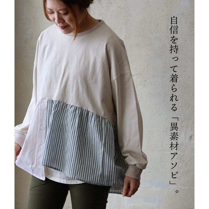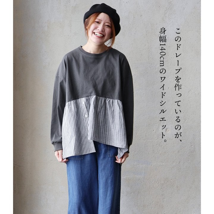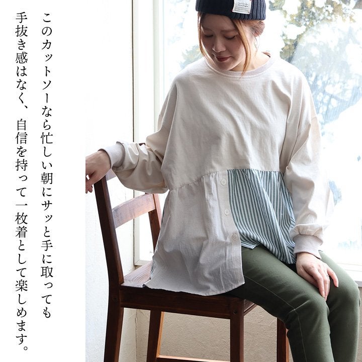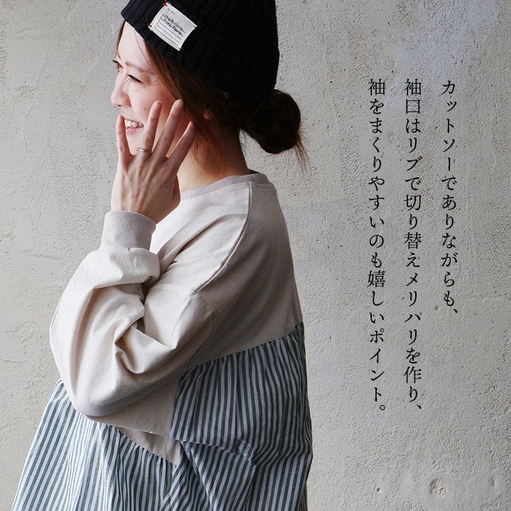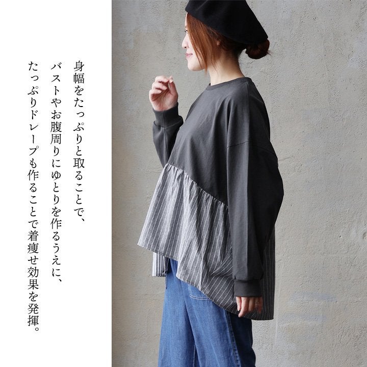 自信を持って着られる「異素材アソビ」。 カットソー 長袖 レディース クルーネック 異素材切り替え 袖リブ 綿100 コットン ストライプ 布帛 体型カバー 大きいサイズ 着痩せ カジュアル パティ