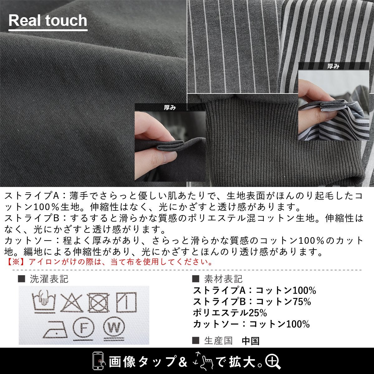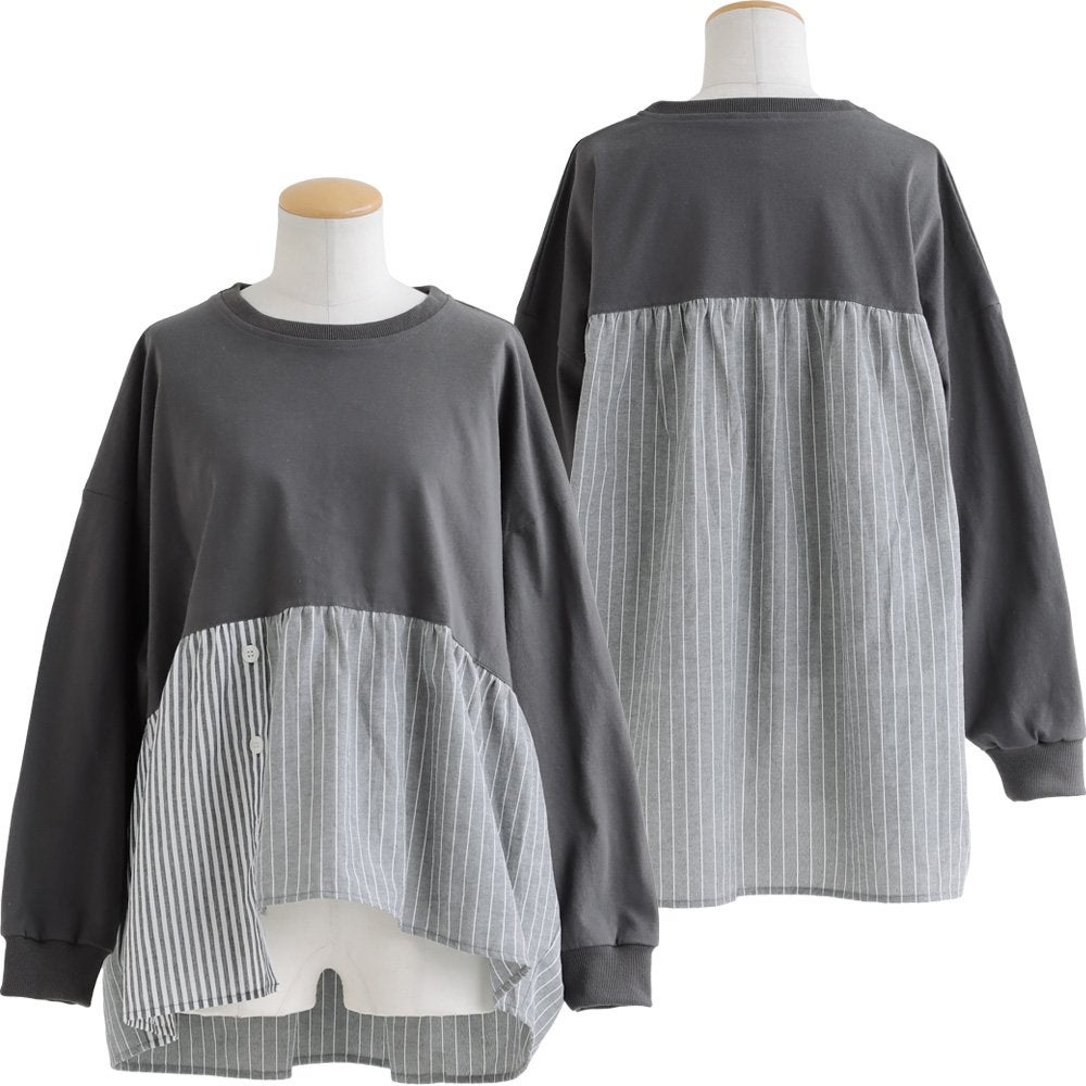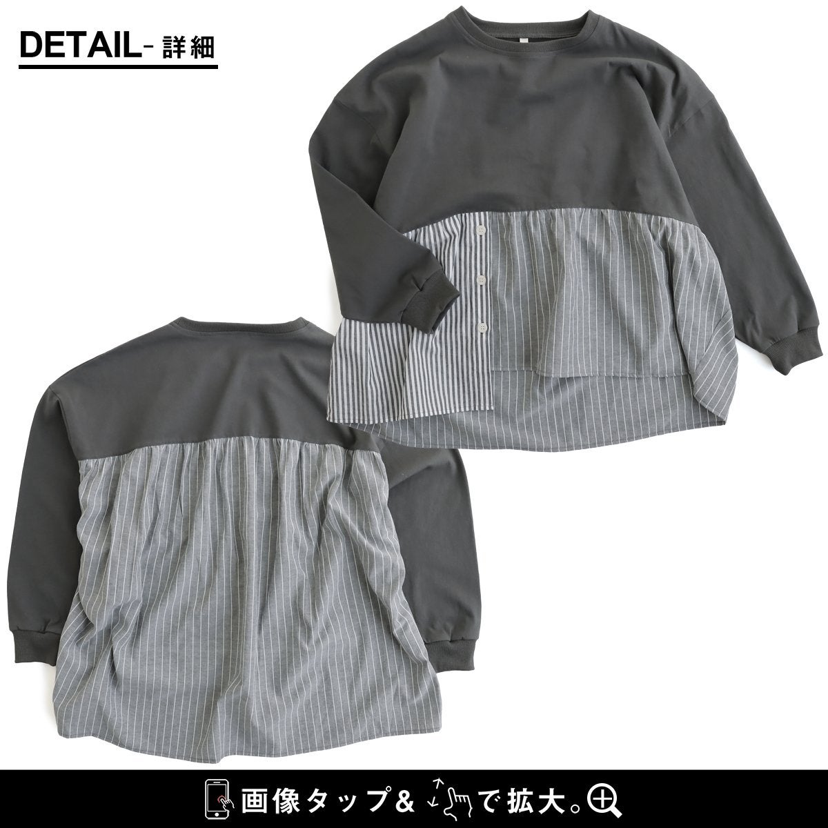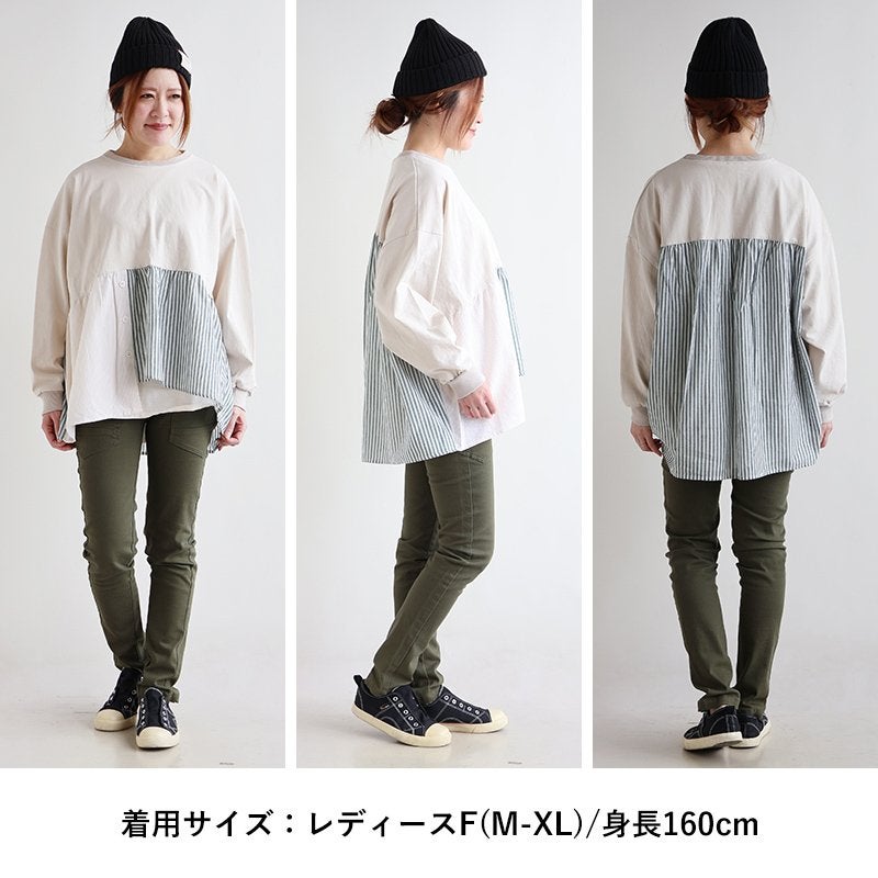 自信を持って着られる「異素材アソビ」。 カットソー 長袖 レディース クルーネック 異素材切り替え 袖リブ 綿100 コットン ストライプ 布帛 体型カバー 大きいサイズ 着痩せ カジュアル パティ