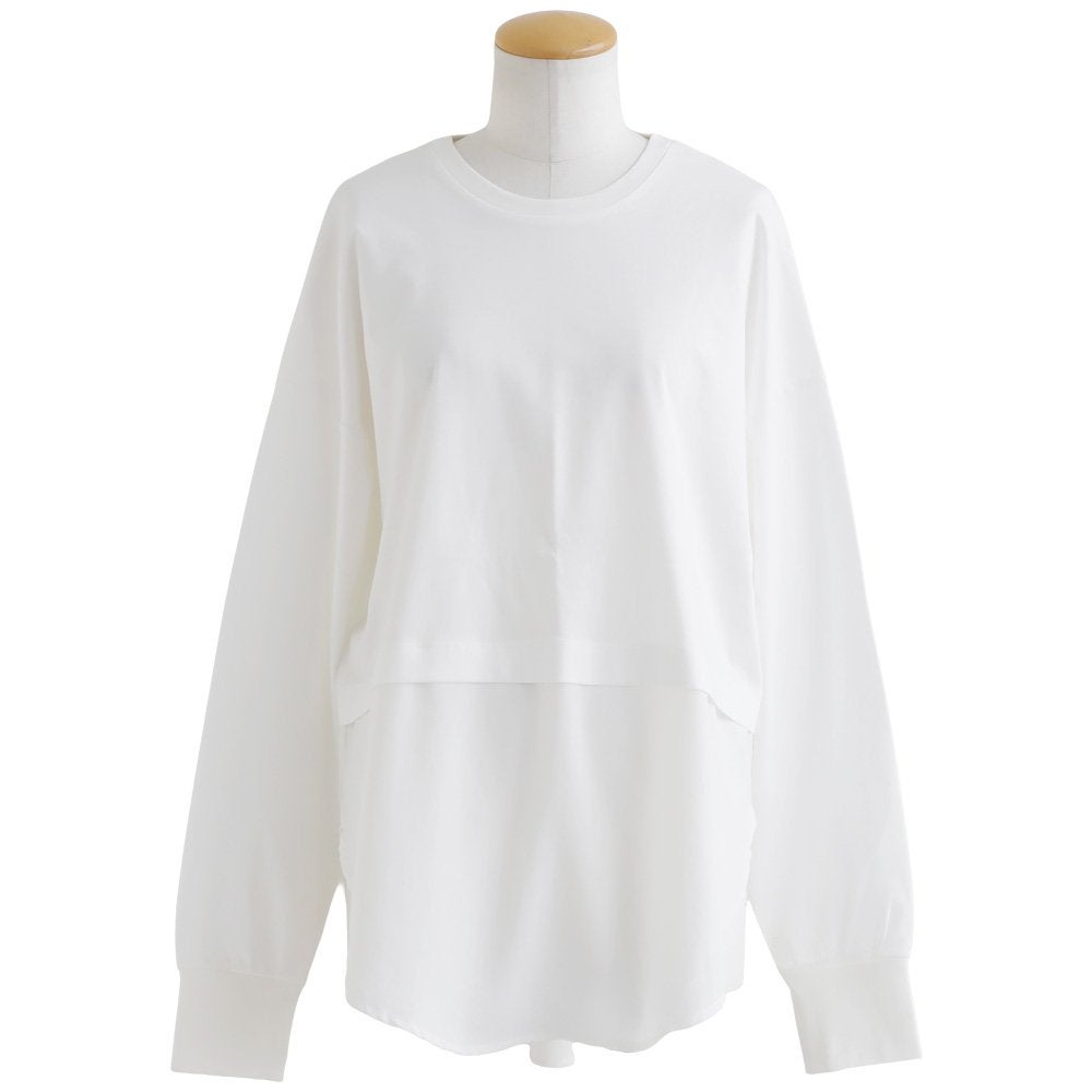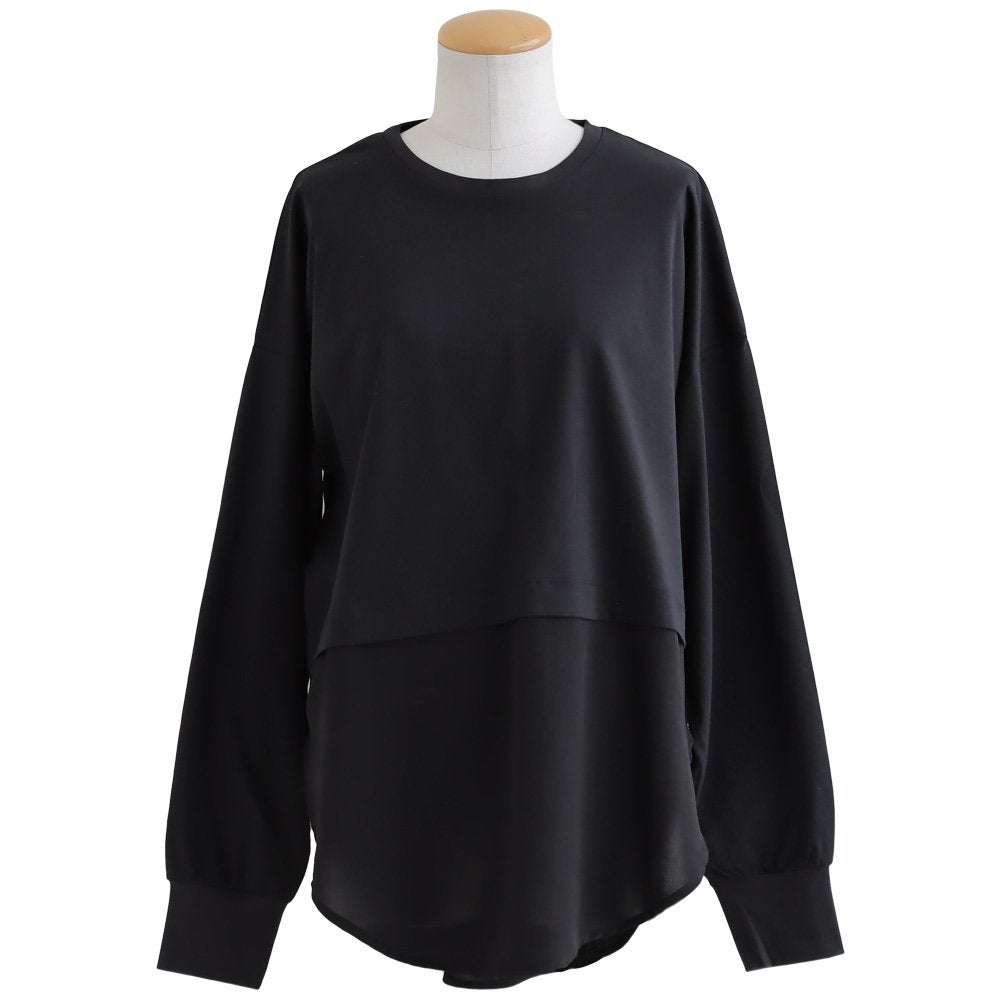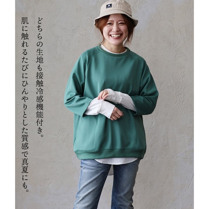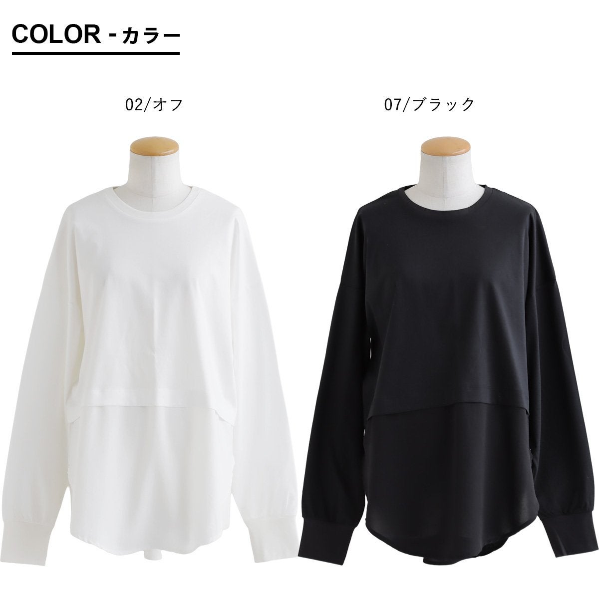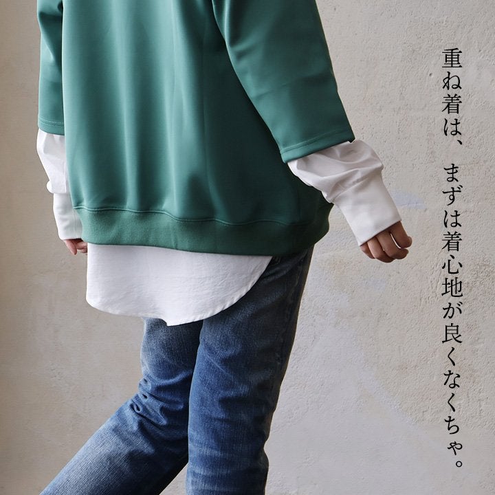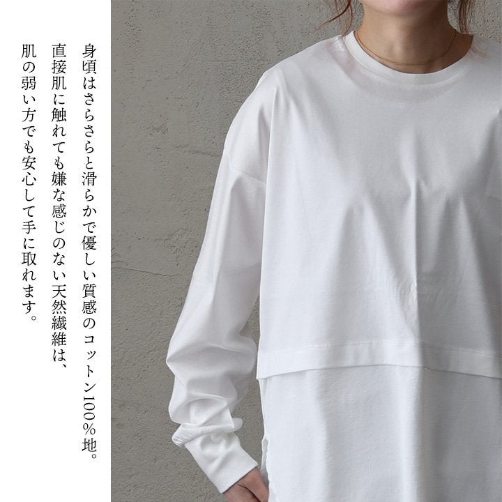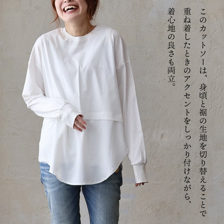 重ね着は、まずは着心地が良くなくちゃ。 カットソー 長袖 レディース クルーネック 重ね着 無地 接触冷感 薄手 軽い 異素材切り替え 綿100 コットン ポリエステル 布帛 袖リブ 大きいサイズ カジュアル パティ