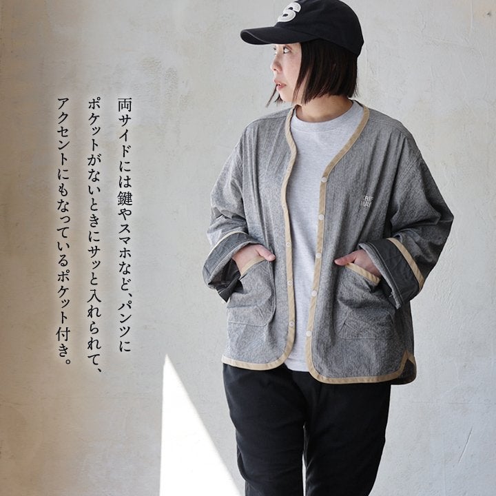 軽やかに羽織れるワーク由来のヒッコリー。 CUBE SUGAR キューブシュガー ジャケット デニムジャケット 長袖 レディース ノーカラー ヒッコリー ストライプ デニム 軽い 薄手 柔らか 大きいサイズ 体型カバー カジュアル パティ