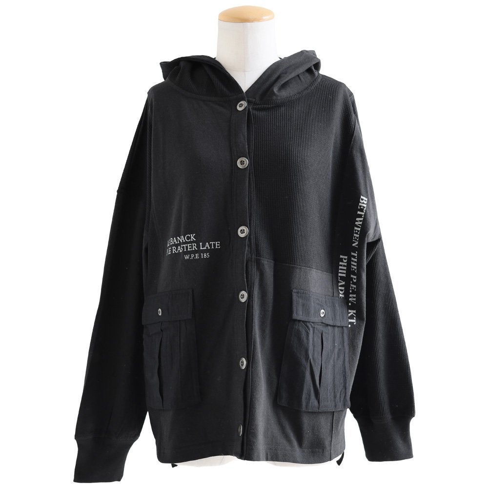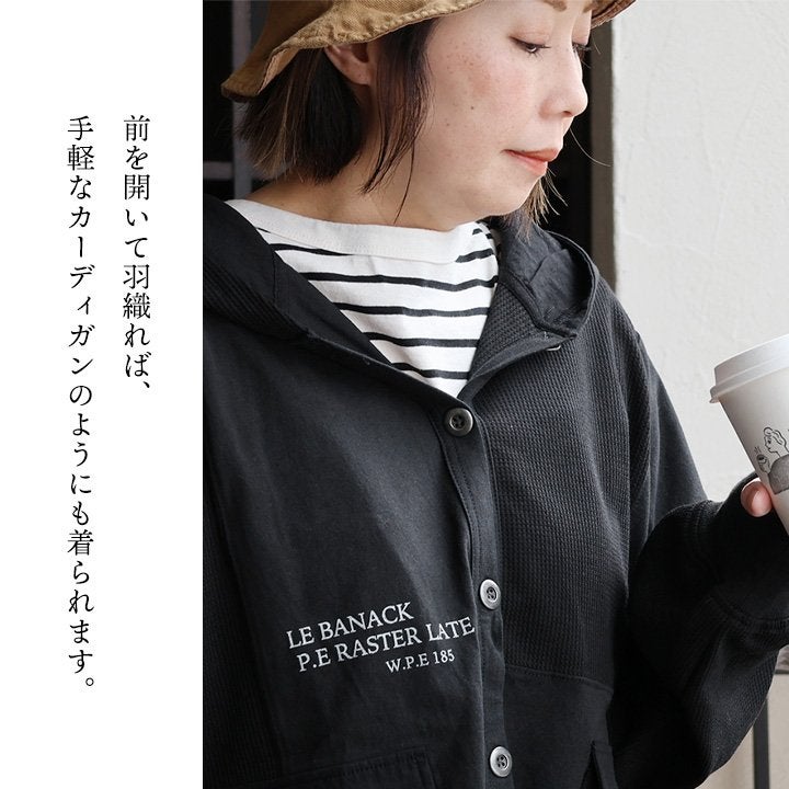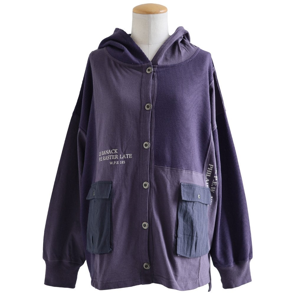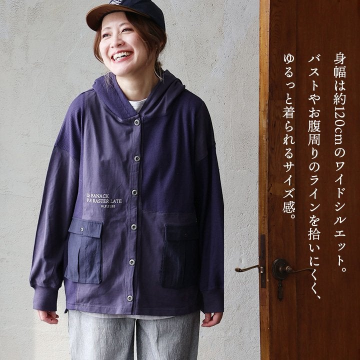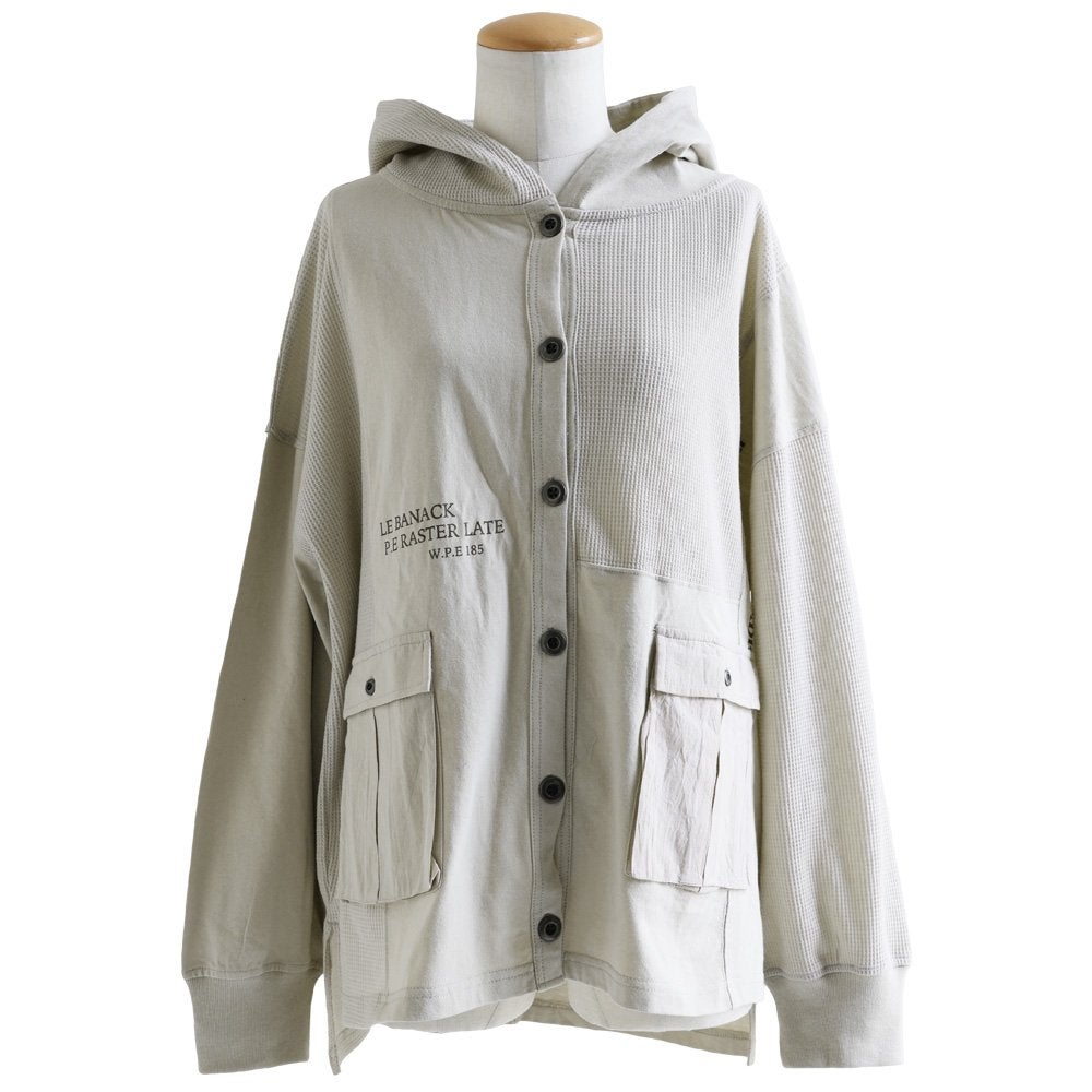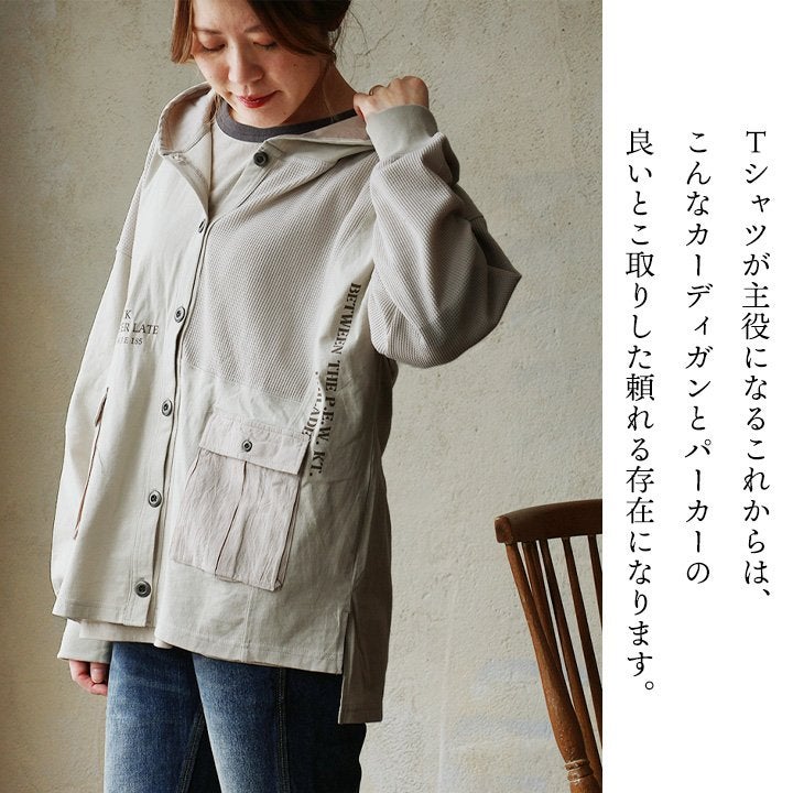 カーディガンとパーカーの良いとこ取り。 カーディガン 長袖 フード付き レディース パーカーカーデ 異素材切り替え 重ね着 天竺 ワッフル 布帛 ロゴ プリント フーディ 通気性 大きいサイズ 体型カバー カジュアル 春 パティ