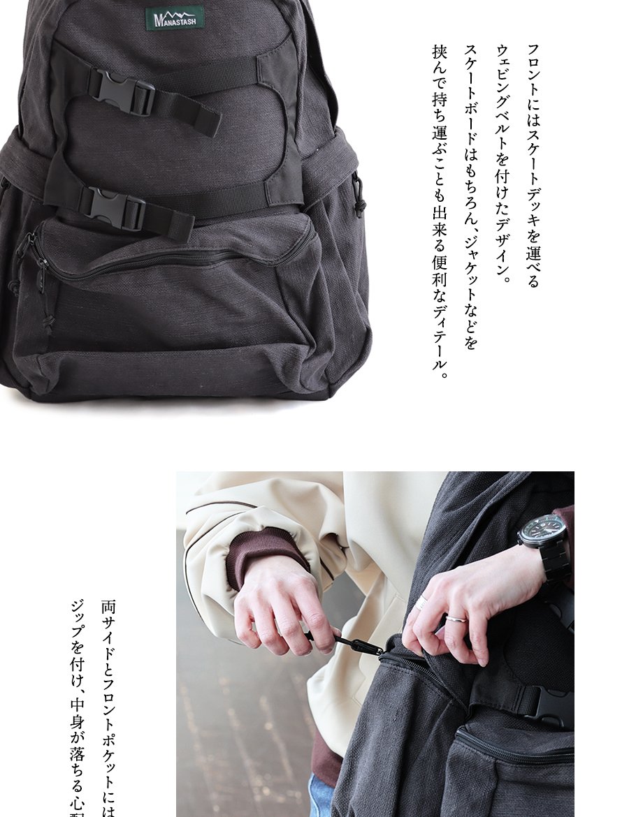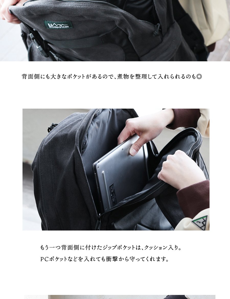6. MANASTASH マナスタッシュ リュック バックパック メンズ レディース 無地 コットン ヘンプ ワンポイント しっかり生地 タフ A4サイズ PCポケット 多収納 たくさん入る カジュアル アウトドア パティ