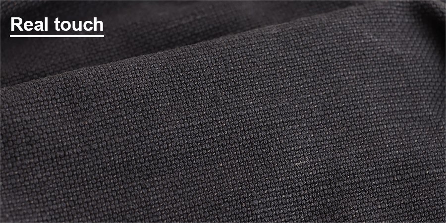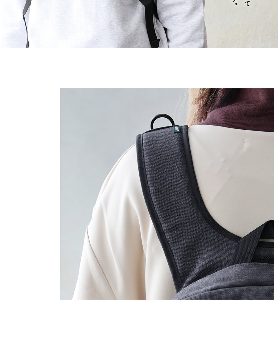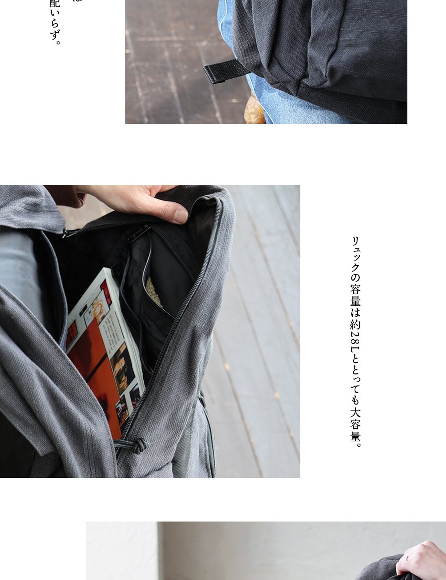 本体:ガシッとタフな質感ながらも、ヘンプの節やムラのあるヘンプ混のコットン生地。伸縮性・透け感はありません。