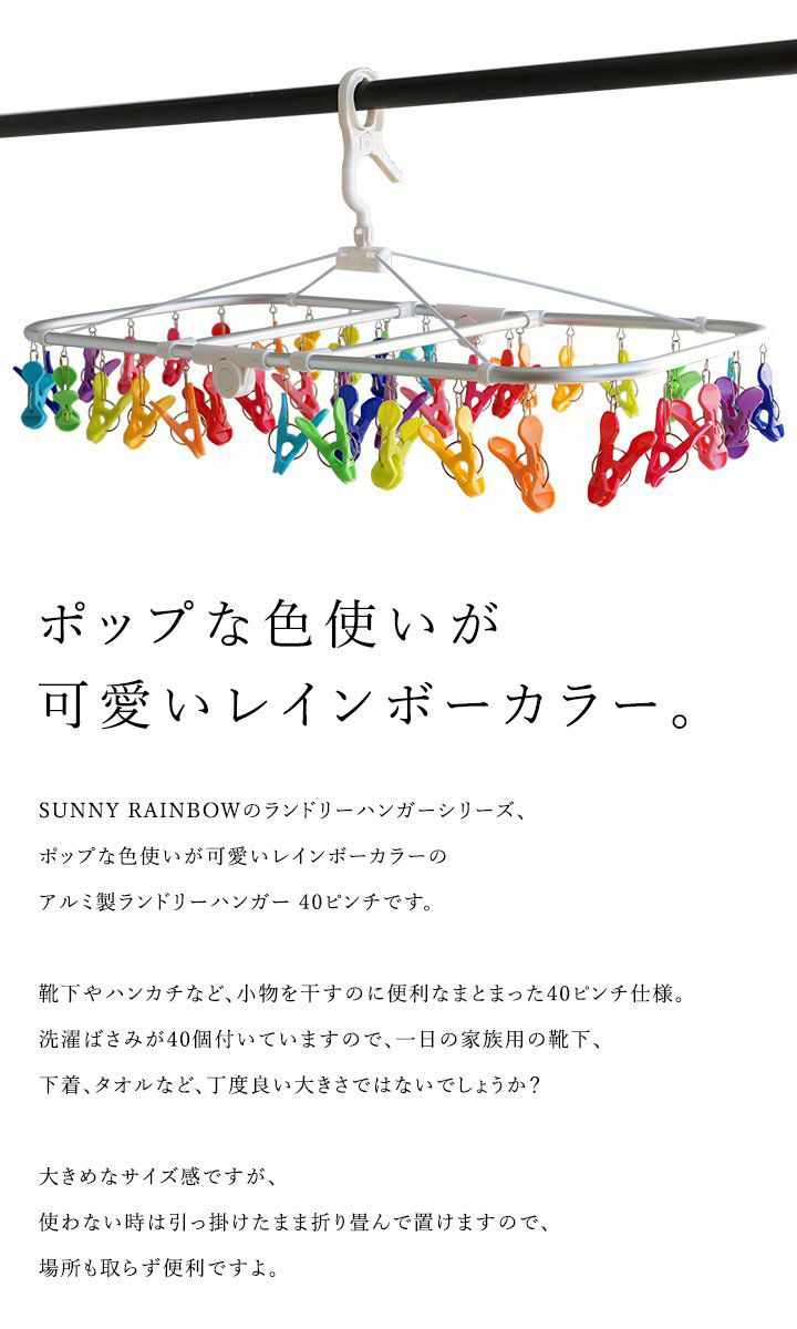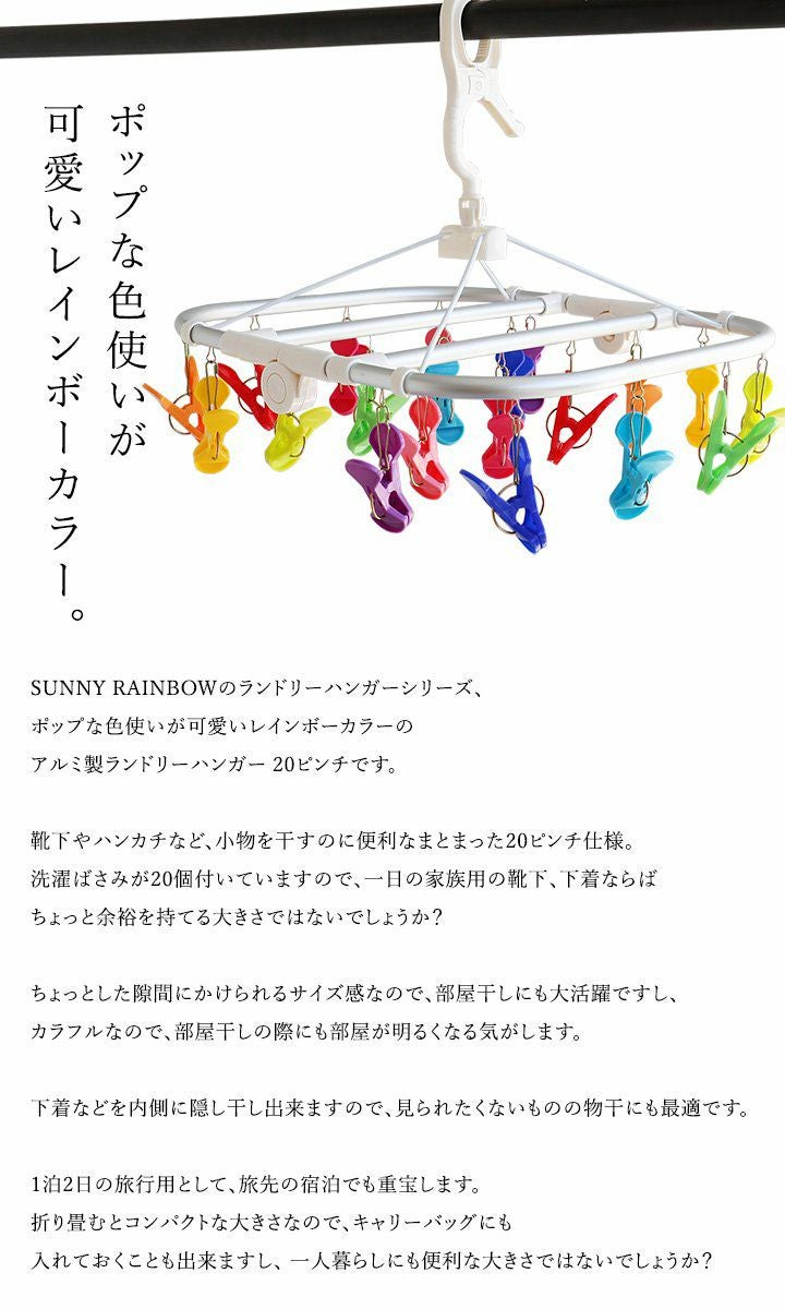 他の画像を見る 下着などの「隠し干し」にも最適! SUNNY RAINBOW ランドリーハンガー 20ピンチ 洗濯ばさみ 20個 ハンガー ポップ アルミ製 レインボーカラー 折り畳み 部屋干し 旅行用 一人暮らし カラフル 2~3日でお届け 販売価格 ¥ 2,420 税込 在庫切れ カートに入れる お気に入りに登録する