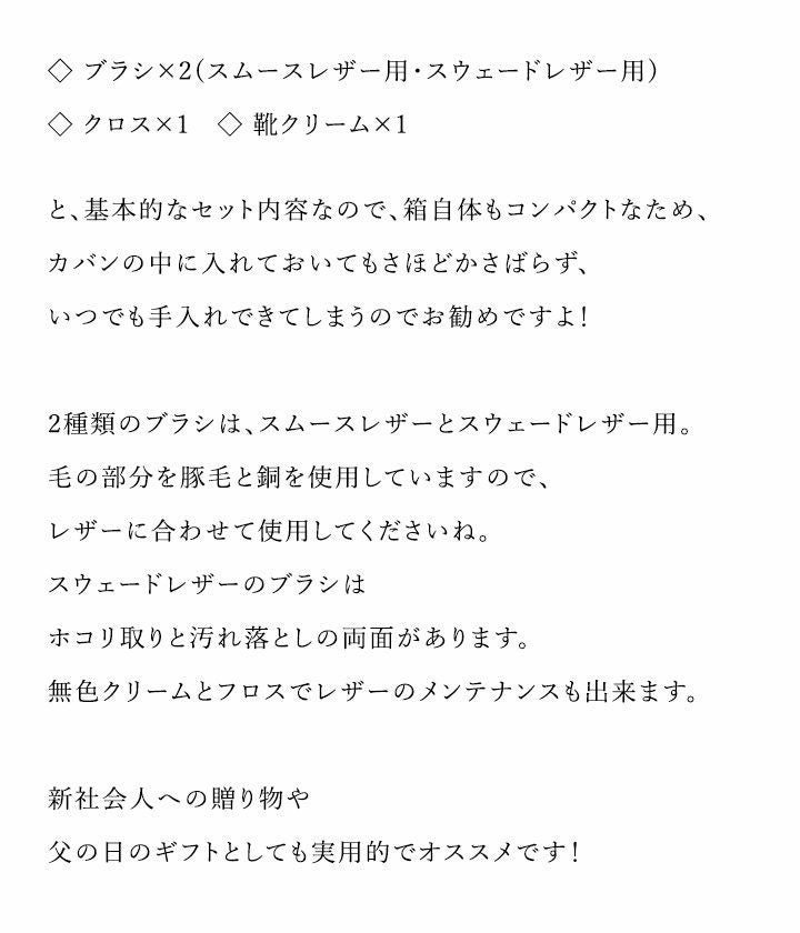 他の画像を見る 新社会人への贈り物としてもオススメです。 シューシャインセット 革靴お手入れセット 缶入 メンテナンス レザーシューズ お手入れ ブラシ クロス 靴クリーム スムースレザー用 スウェードレザー用 贈り物 ギフト 販売価格 ¥ 880 税込 在庫切れ 詳細を見る お気に入りに登録する