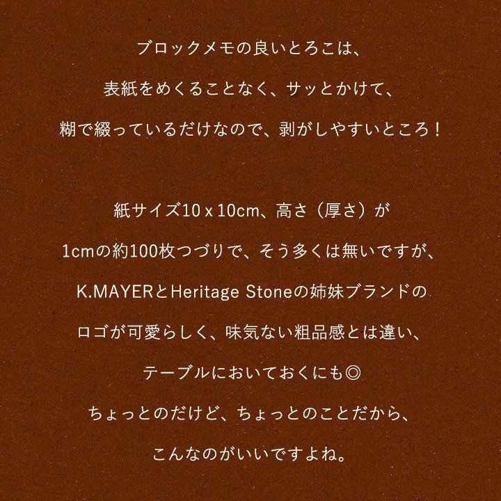 他の画像を見る なんだかんだ、やっぱりアナログがいちばん! 【単品注文不可】 メモ帳 ブロックメモ メモパッド 『K.MAYER Heritage Stone』 ロゴ入り KRIFF MAYER [クリフメイヤー] 2~3日でお届け 販売価格 ¥ 1 税込 在庫切れ カートに入れる お気に入りに登録する