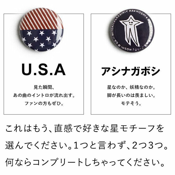 他の画像を見る やっぱり「★」が好きだっ! 缶バッジ 缶バッチ 「星 スター STAR シリーズ」 スプリングピン のの字ピン ピンタイプ 雑貨 約25mm 帽子 バッグ 目印 お洒落 カワイイ 可愛い 【メール便01】 2~3日でお届け 販売価格 ¥ 330 税込 在庫切れ カートに入れる お気に入りに登録する