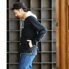 【モデルコメント】中は、Teeやカットソーくらいって感じです。フィット感が出ない程度にゆとりがあって、ジャストサイズって感じでしたね。 【客観的コメント】ごったくよりガッチリした人だと、フィット感が出ちゃいそうなサイジングだね。