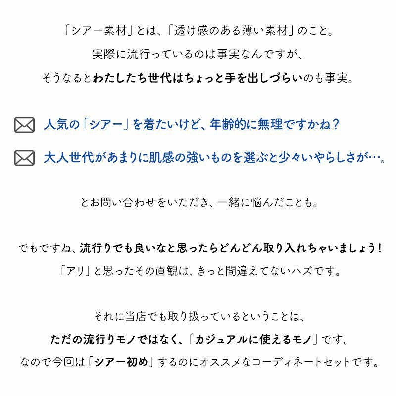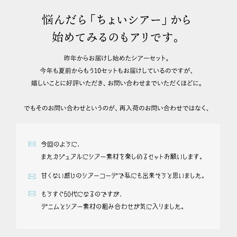 他の画像を見る 「人気の「シアー」を着たいけど、年齢的に無理?」と思ったら。 コーディネートセット コーデセット 夏 セットアップ 夏 コーディネートセット 福袋 セットアップ レディース ユニセックス カジュアル お試し フリー パティ 販売価格 ¥ 13,299 税込 在庫切れ 詳細を見る お気に入りに登録する
