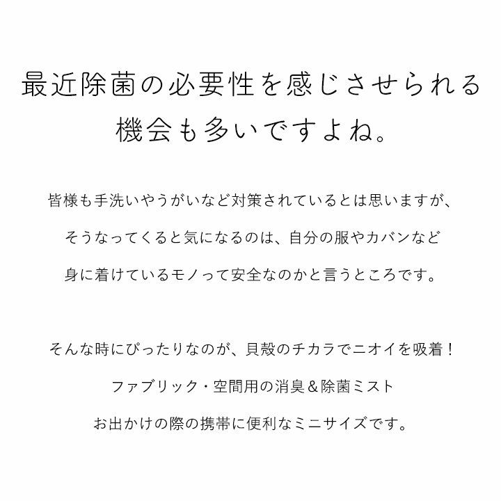 他の画像を見る 貝殻のチカラでニオイを吸着! 【メール便10】 ケッシー 消臭 除菌 ミスト スプレー 携帯用 無香料 貝殻 ファブリック用 空間用 ミニサイズ 99.9%除菌 ノンアルコール 40代 50代 おしゃれ 2~3日でお届け 販売価格 ¥ 935 税込 詳細を見る お気に入りに登録する