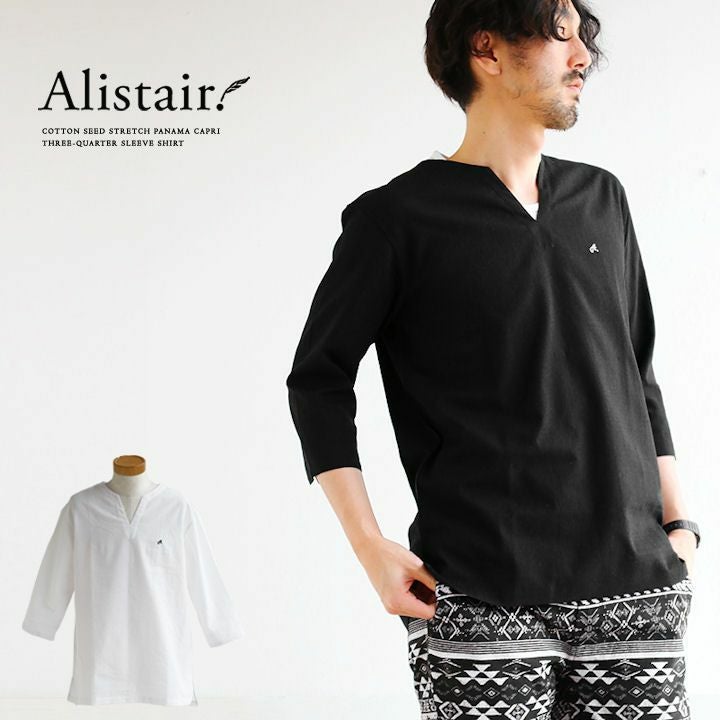 「暑さ」「汗」「動きづらさ」を、『サラッと涼しく』へ。 (アリステア) ALISTAIR 七分袖 シャツ プルオーバー キーネック ワイド 綿麻 ストレッチ シアサッカー