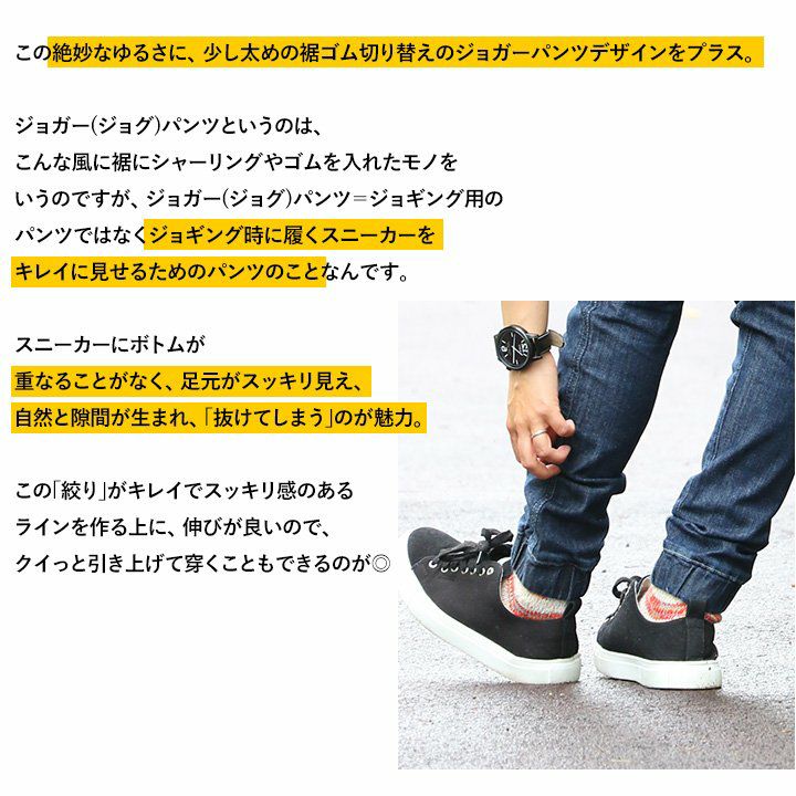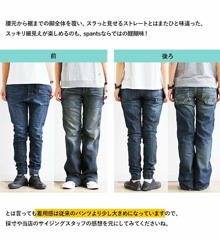 大泉くらいの体型ならXSサイズは穿けなくはないサイジングだね。全体的にフィット感はあるけれども、伸縮性があるから、窮屈感は全然なかったよ。すっきりとシルエット重視ならXSサイズ、少しゆとりを持って穿くならSサイズって感じだね。