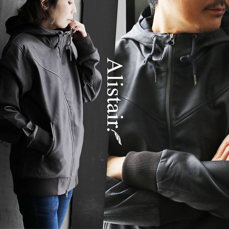 【アウトレット】【撮影使用分】 ブルゾン フェイクレザー レディース メンズ スリム ハイネック フード リブジャケット カジュアル パティ ALISTAIR アリステア