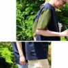 本体(身頃/シャドーカモ):薄手でサラサラとしたドライタッチ地。織りによるハリ感が強くあり、とっても軽やか。シャカシャカと音がなり、伸縮性は微妙に少しあり、光にかざすと強い透け感があります。