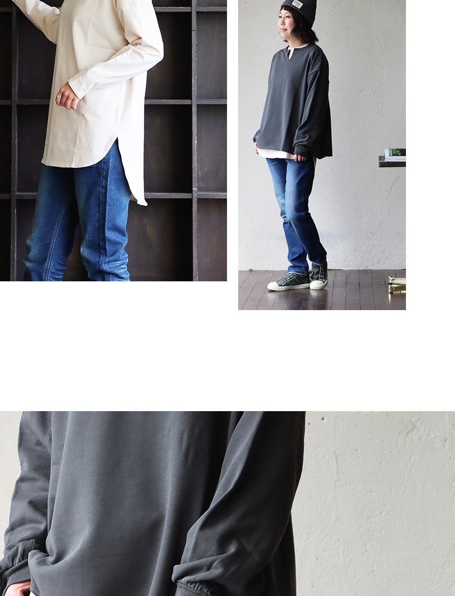 程よく厚みのある度詰め天竺地。しなやかさもありつつ、しっかりと目の詰まったタフな生地感で、軽やか。編地による伸縮性がややあり、光にかざすと若干の透け感があります。