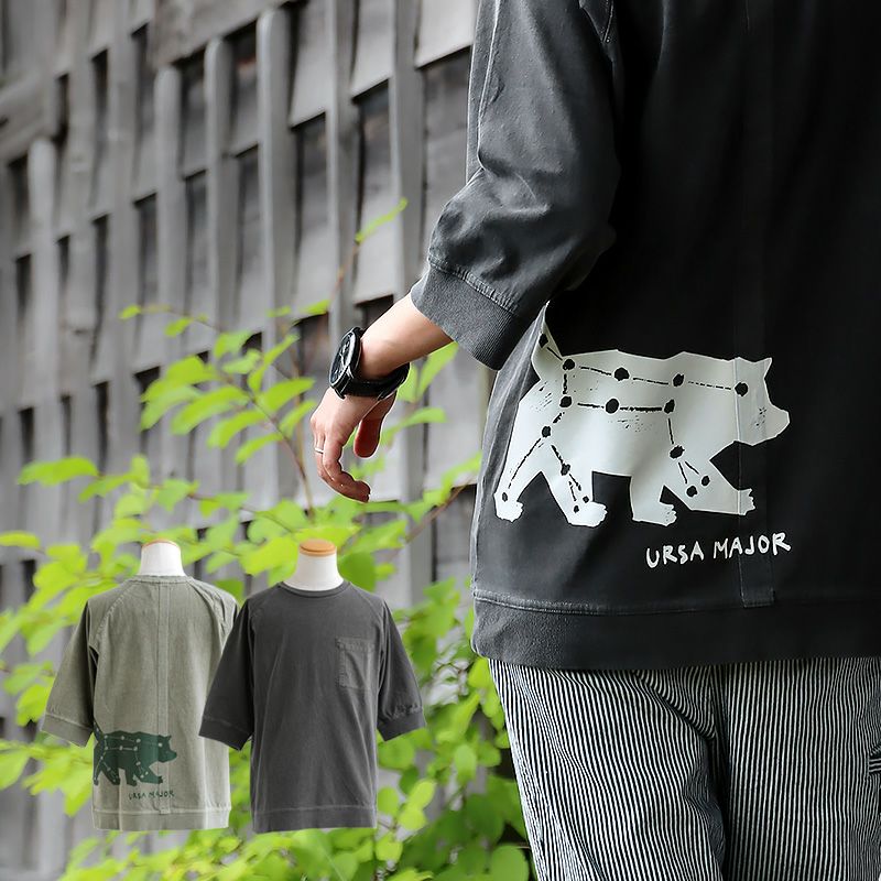 洗濯後もガシっ!とタフ。変わる雰囲気。ハマる色合い。 6分袖 カットソー メンズ レディース ラグラン 綿100% ピグメント加工 経年変化 生地切替 ポケット 裾リブ クマ 星座 プリント Tシャツ ティーシャツ 重ね着 夏 晩夏 7分袖 半端袖 二の腕隠れる お尻隠れる 大きいサイス LL XL 2L 大人 PATY パティ OAR’S オールズ