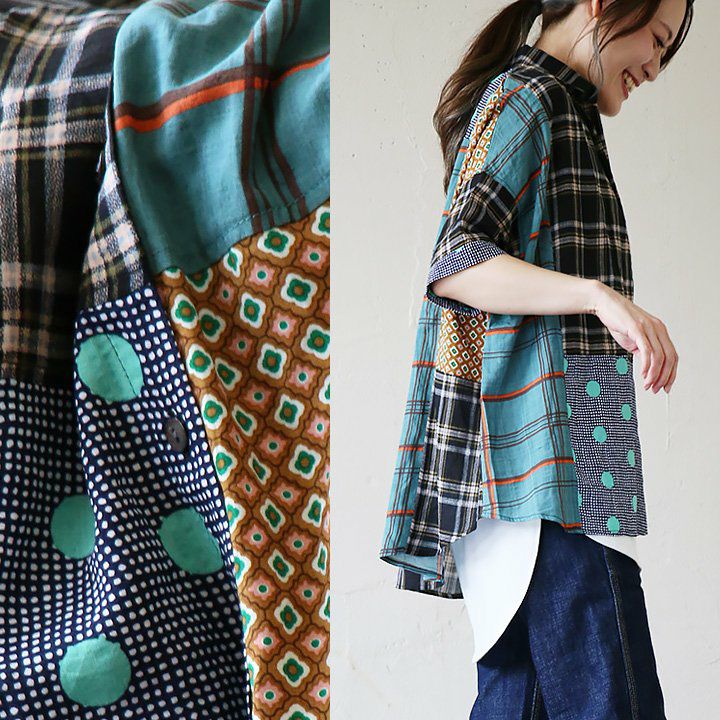 「柄、ガラ、がら。」柄好きさんのための一枚。 ブラウスシャツ 5分袖 レディース 総柄 ドット チェック 花柄 パッチワーク 薄手 軽い 涼しい 夏 夏服 ゆったり 体型カバー 大きいサイズ 着痩せ カジュアル PATY パティ sandy サンディ