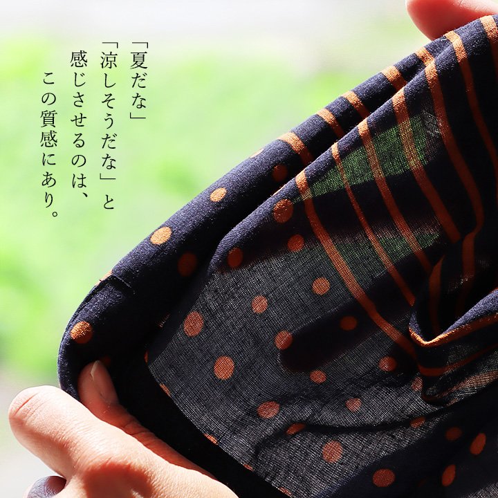 薄手でふわっと軽い、綿100%の生地。シアサッカー風の凹凸があり、柔らかな質感です。伸縮性はなく、光にかざすと透け感があります。