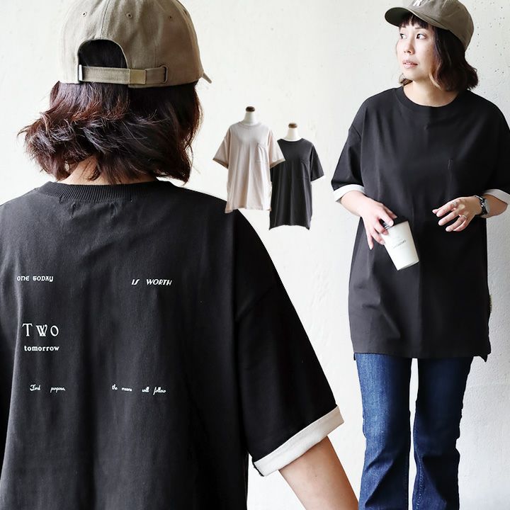 6. Tシャツ 半袖 チュニック ロング丈 レディース お尻隠れる バックプリント 配色切り替え 綿100% 天竺 伸縮性 通気性 夏 夏服 ゆったり 体型カバー 着痩せ カジュアル PATY パティ KAKELA&TRANQUIL カケラ&トランクイル