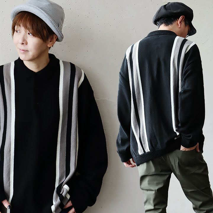 レトロだけど、「程よい抜け感」が大人。 ニット ニットポロ ポロシャツ メンズ レディース 配色ライン ストライプ アクリル100% 暖かい しっかり生地 丈夫 大きいサイズ ゆったり 重ね着 カジュアル レトロ 秋 冬 PATY