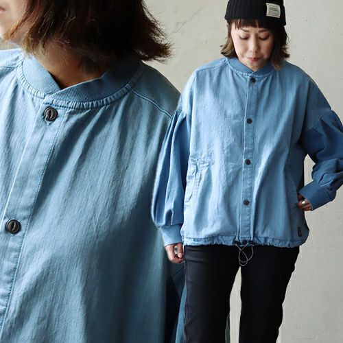 バサッと羽織れる「安心」と「工夫」があるから。 ブルゾン レディース リブネック ミドル丈 大きいサイズ 無地 ワイド ジャケット 布帛 デニム カットソー 異素材切り替え お尻が隠れる 前後差 ピグメント加工 褪せ色 かっこいい おしゃれ PATY パティ BLUETO ブルート