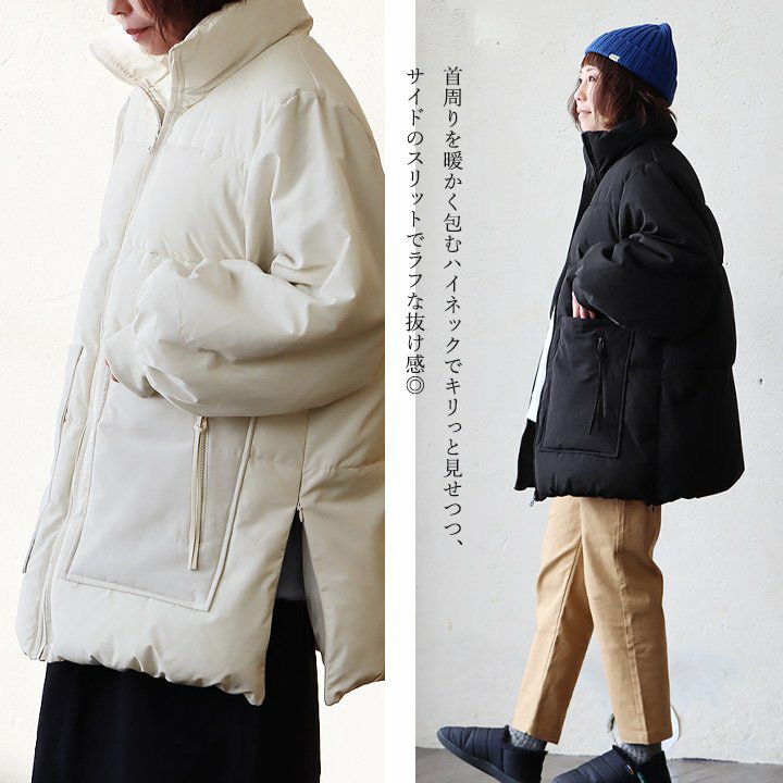 驚くほど軽くて暖かく、抜け感まで持ち合わせた『疑似ダウン』。 ジャケット ブルゾン レディース ハイネック ミドル丈 スリット 中綿 sorona 軽い 防寒 暖かい 細見え 冬