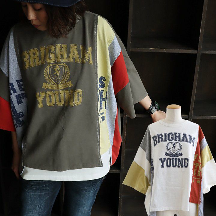 「これくらいガッツリカジュアルなのが欲しかった!」 【メール便50】 Tシャツ 半袖 レディース クルーネック リメイク風 配色切り替え クレイジー 裾アシメ 着痩せ 綿100% コットン ゆったり 大きいサイズ 体型カバー カジュアル 夏 メンズライク パティ GENTIL ジャンティ