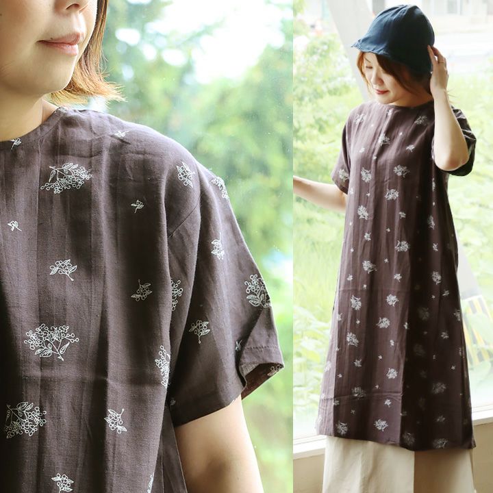 5. シャツ ワンピース シャツワンピ 半袖 レディース 花柄 プリント 綿麻 レーヨン 薄手 シアー 涼しい 軽い 体型カバー すっきり 大人カジュアル 夏 パティ