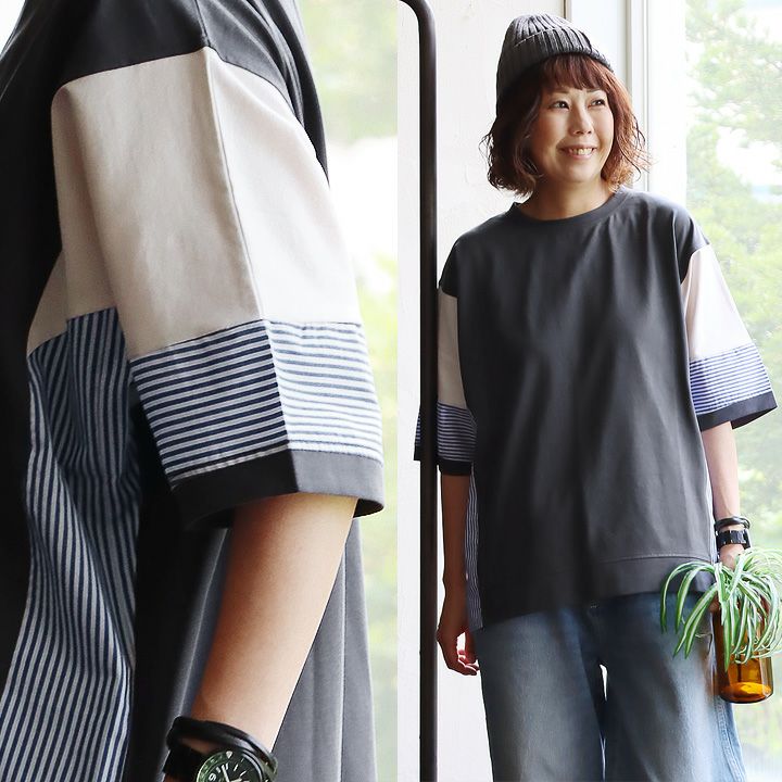 重ね着以上の存在感と、すっきり着痩せまで。 【メール便50】 カットソー ワイド 5分袖 レディース 表裏 配色切り替え ストライプ コットン ポリエステル 軽い 涼しい ゆったり 大きいサイズ 着痩せ カジュアル 夏 夏服 パティ