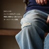 厚すぎず程よいハリのある、コットン100%ノンストレッチデニム生地です。しっかりとしていながらも重たくなく、軽い着用感。透け感はありません。