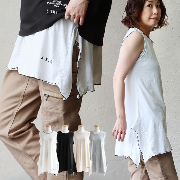 Tシャツの裾から覗かせて。 タンクトップ ロング レディース 重ね着 変形 お尻 カバー 薄手 綿100% コットン ロング丈 ワイド 配色 メローロック ストラップ 軽い 大人 すっきり 春 夏 秋 冬 安心 KAKELA&TRANQUIL カケラ&トランクイル