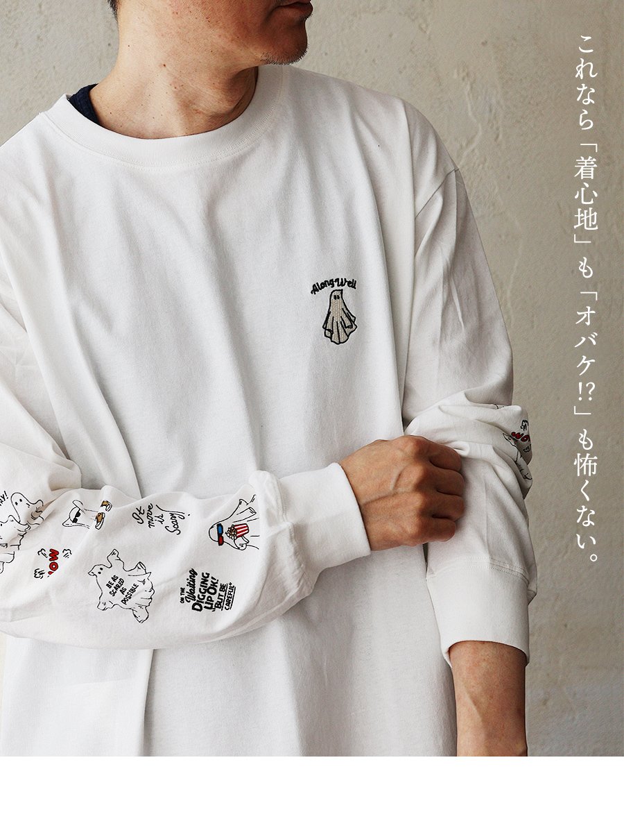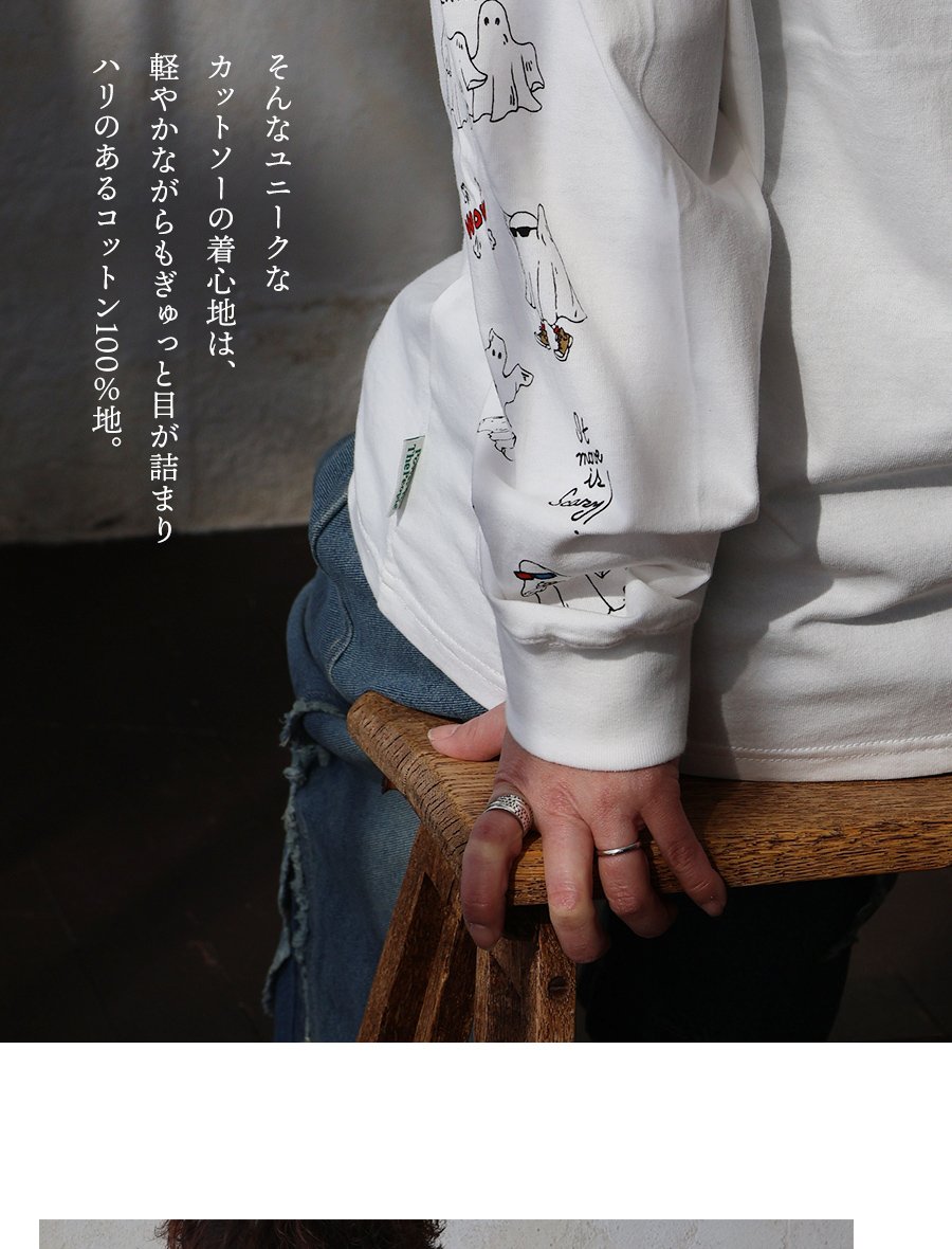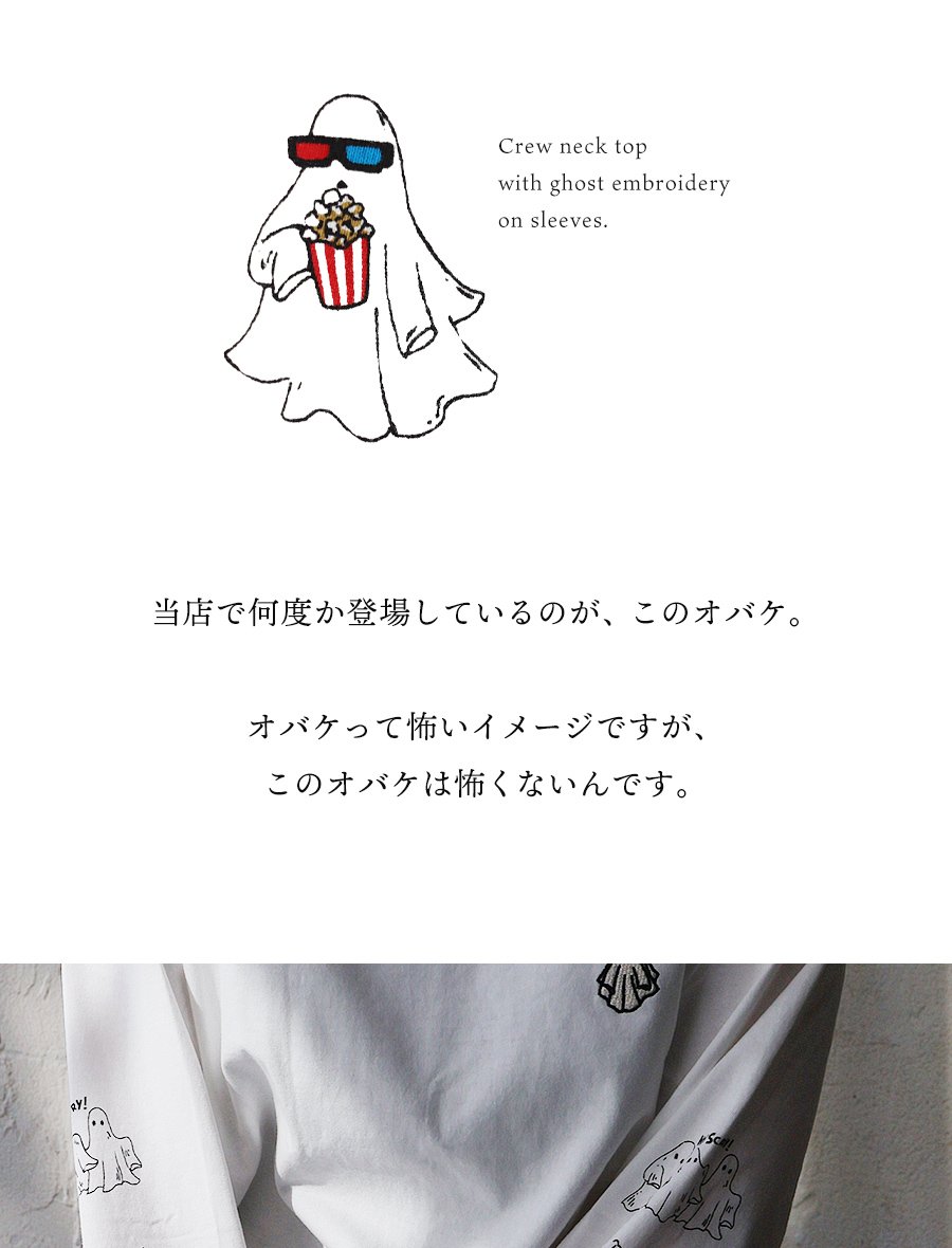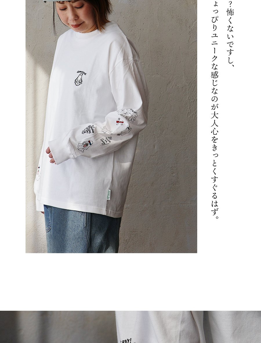 これなら「着心地」も「オバケ!?」も怖くない。 カットソー 長袖 メンズ レディース クルーネック キャラクター 刺繍 オバケ 綿100 コットン 通気性 袖リブ ゆったり 大きいサイズ カジュアル パティ