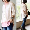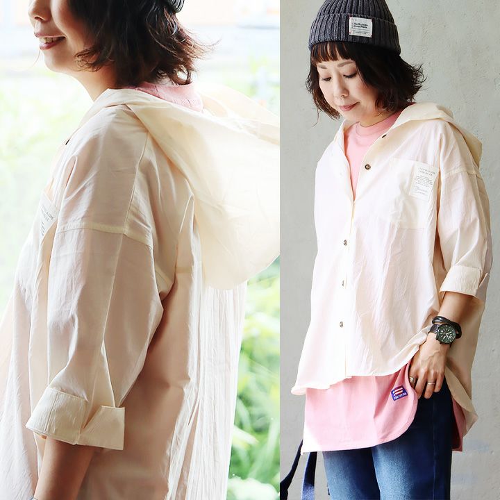 シャツとパーカーの良いとこどり。 シャツ フード付きシャツ 7分袖 レディース 重ね着 胸ポケット ピスネーム 綿100 コットン 薄手 軽い 通気性 ゆったり 体型カバー 大きいサイズ カジュアル 春 夏 秋 パティ