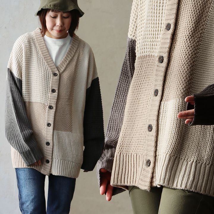 優しく、可愛く、ほっこり、暖かく。 カーディガン カーデ 長袖 ニット レディース Vネック クレイジー パッチワーク 配色切り替え アクリル100 伸縮性 暖かい ゆったり 大きいサイズ カジュアル 秋 冬 パティ