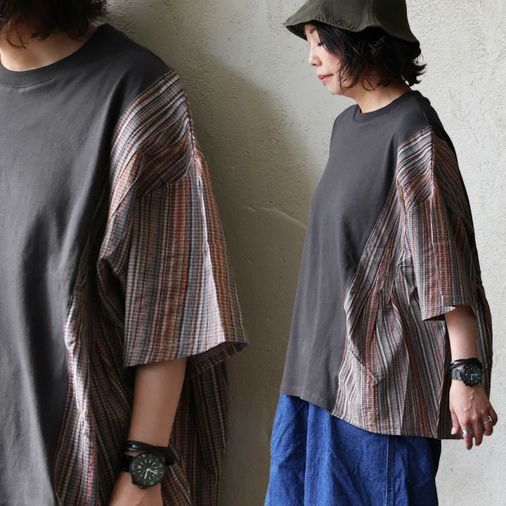 オリエンタルな柄が作る「着痩せ」。 カットソー 5分袖 レディース 配色切り替え 無地 ストライプ 着痩せ すっきり 綿100 コットン ゆったり 大きいサイズ 体型カバー カジュアル 春 夏 秋 パティ