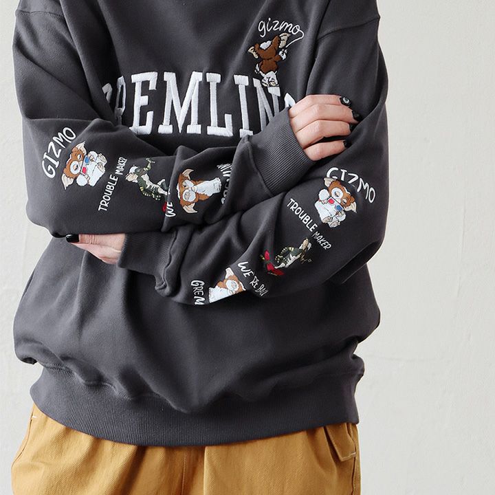 いたらずら好きの「モンスター!?」 スウェット トレーナー 長袖 クルーネック メンズ レディース ロゴ 刺繍 袖プリント グレムリン キャラクター T/C 裏毛 伸縮性 体型カバー 大きいサイズ カジュアル 春 パティ