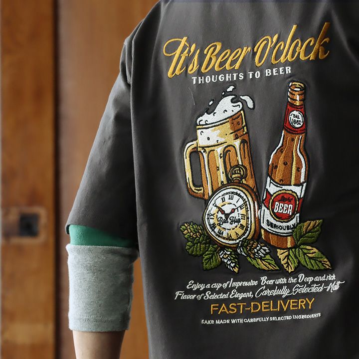 ビールが飲みたくなったなら、このTシャツでアピール!? Tシャツ 半袖 メンズ レディース クルーネック ビール 刺繍 ロゴ 綿100 コットン 天竺 オープンエンド しっかり生地 伸縮性 タフ カジュアル レトロ パティ